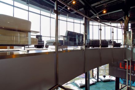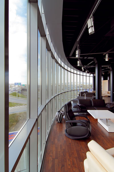 Prvé nadzemné podlažie je oproti ostatným podlažiam ustúpené, čím sa sleduje funkčnosť a využitie pozemku. Oceľová konštrukcia je zabezpečená požiarnym systémom stabilného hasiaceho zariadenia. Vo svojej zvislej a vodorovnej polohe je ošetrená náterom antracitovej farby, ktorá v súlade s podlahou a v kontraste s bielymi stenami a rastrom osvetľovacích telies vytvára vhodný priestor na vystavovanie interiéru a doplnkov.