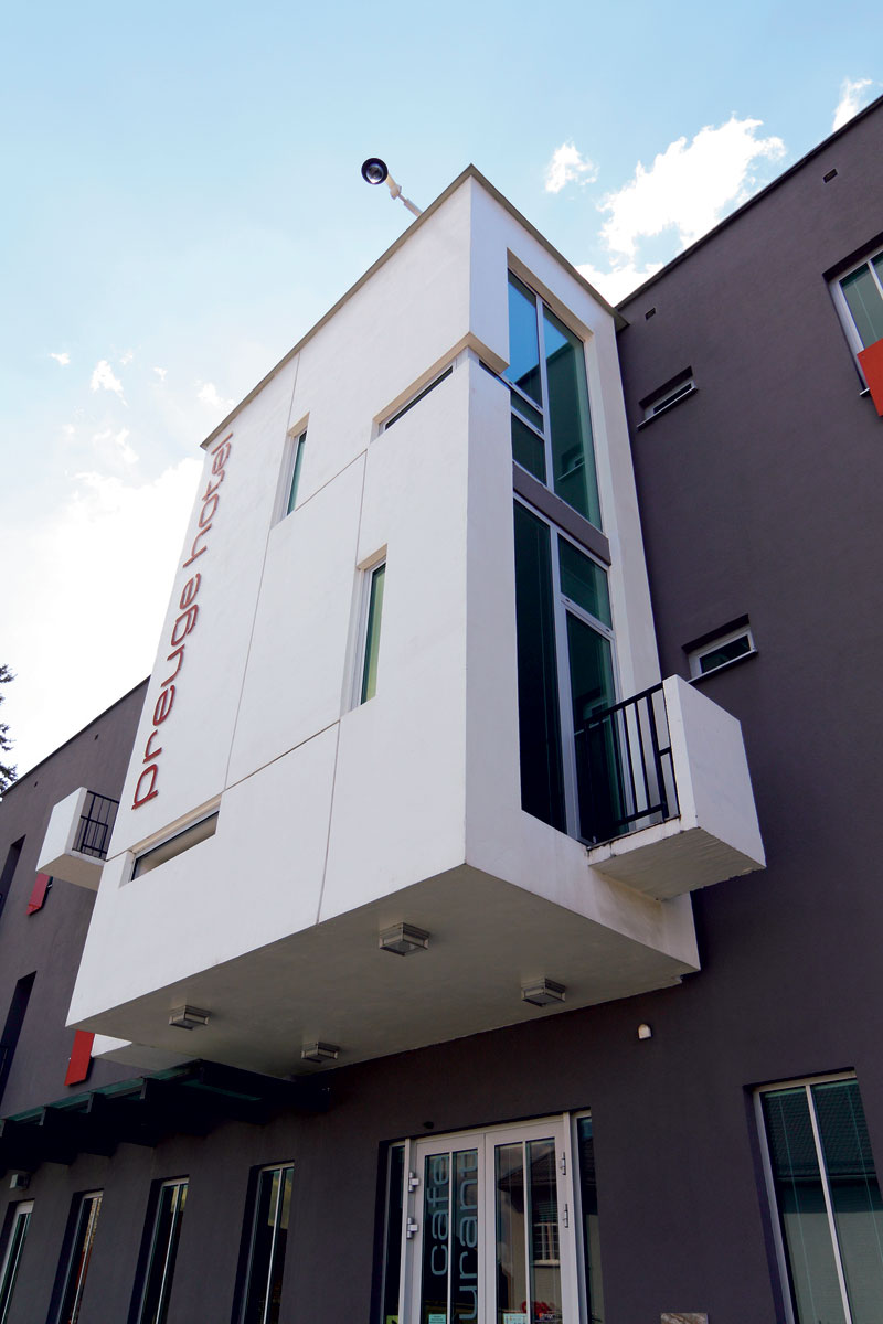 Objekt je navrhnutý v minimalistickom štýle. Akékoľvek výrazové prostriedky autori používajú veľmi triezvo a úsporne. Začína sa to základnou farebnosťou, kde do kombinácie bielej a sivej omietky vložili len malé akcenty v podobe červených obdĺžnikov. Materiálové riešenie exteriéru dopĺňa biela prístavba zozadu uličného traktu ako kombinácia veľkoplošných sklenených tabúľ s lamelovou tieniacou clonou a zdanlivo náhodne rozmiestnených úzkych okien. Tento obrazec sa nachádza aj na zadnej čiernej veži, kde okná presvetľujú zadné schodisko. Sú pomyselnou odozvou na rovnakú grafickú hru na arkieri z uličnej strany. Ten je na dvoch podlažiach atraktívnou súčasťou hotelových apartmánov.