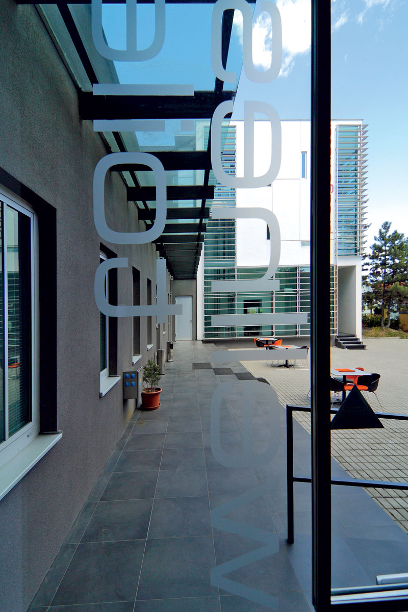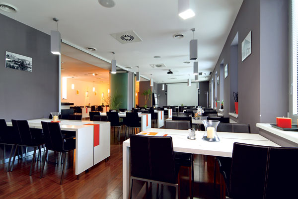 Dizajn interiéru štýlovo dopovedal architektonický zámer načrtnutý v exteriéri. Strohá farebnosť a grafické skratky vložených farebne výrazných plôch sa opakujú aj na zariadení v reštauračnej a kaviarenskej časti. Aby priestory nepôsobili príliš chladne a neosobne, autori siahli po pocitovo teplej keramickej podlahe s drevenou kresbou, ktorá túto časť príjemne zútulňuje. Zariadenie hotelových izieb má rovnaký rukopis. Pri prechodnom ubytovaní to nemusí byť na škodu, čistota tvarov a jednoduché zariadenie oslovia široké spektrum klientely. Plusom je oživenie snehobielych stien medenou dizajnovou omietkou, ktorá je vhodným kontrastom k sivým podlahám.