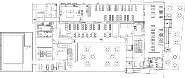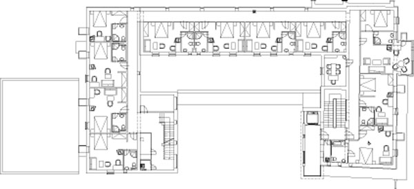 V zadnom krídle sa nachádza kuchyňa, zázemie a smerom k zadnému parkovisku vstup pre zamestnancov a zásobovanie. Nachádza sa tu aj práčovňa s možnosťou priameho zhodenia použitej bielizne z obytných podlaží, ďalej šatne, masér a wellness prepojená s bazénom a napokon zadné schodisko do vyšších podlaží pre ubytovaných hostí. Sú tu situované aj zadné toalety, slúžiace v lete aj pre hostí v átriu. Z átria sa do prednej časti k recepcii a výťahu dostaneme zaskleným vstupom vo výraznej zadnej veži tienenej lamelami. Na druhom až štvrtom nadzemnom podlaží je spolu 22 izieb, vrátane jednej rodinnej, dvoch bezbariérových a dvoch apartmánov.