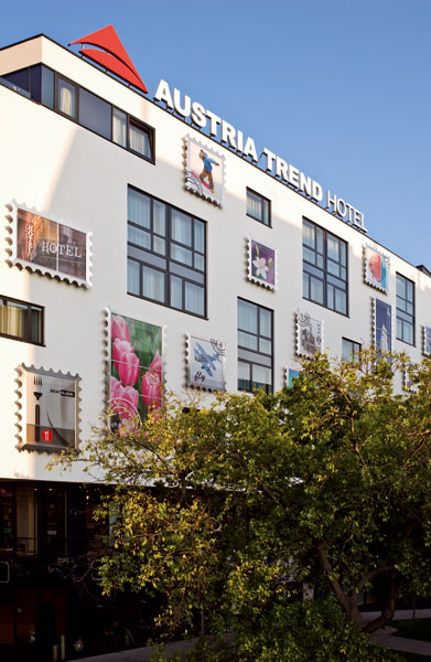 Detail konštrukcie poštovej známky Austria Trend Hotela v Bratislave