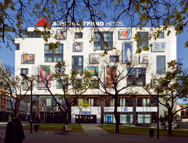 „Známky dodávajú stavbe celkom iný náboj aj novú marketingovú kvalitu, ale v podstate sa na fasáde vôbec nemuseli objaviť. Investor pre realizáciu tohto detailu prakticky ukrojil časť svojho zisku,“ pokračuje architektka. Postupom času sa obrázky na fasáde vystriedajú, vďaka čomu sa výraz domu bude určitým spôsobom meniť. Záleží len na prevádzkovateľovi, ako túto možnosť využije vo svoj prospech. Architekti si ako autori riešenia vyhradili právo odsúhlasiť motívy, ktoré sa na fasáde objavia. „Chceme tak zabrániť najmä vystavovaniu komerčných obsahov na ploche hotela. Reklama nás zaplavuje z každej strany, preto je dôležité vyberať neutrálne motívy, ktoré nebudú na nikoho robiť nátlak,“ dodáva Monika Štekláčová.