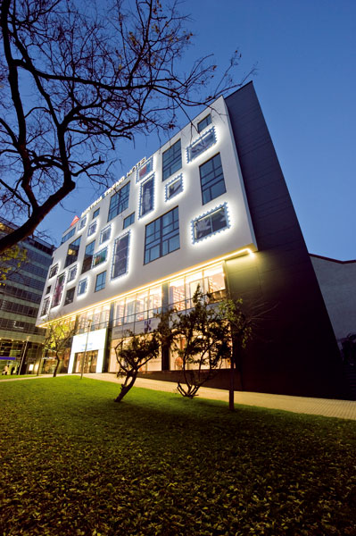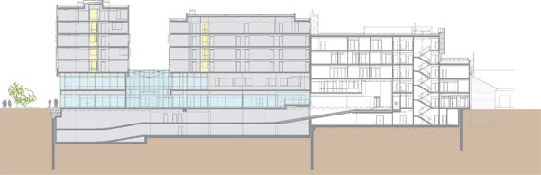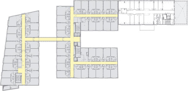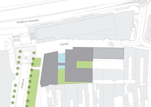 K hotelu sa pripája aj menší administratívny objekt s architektonickým odlíšením jeho funkčnej náplne. „Nechceli sme, aby na mieste vznikla hradba súvislej steny, ale snažili sme sa prostredníctvom variabilného stvárnenia fasád docieliť, aby objekt výrazovo prispel k premenlivosti celej ulice,“ hovorí architektka Monika Štekláčová.