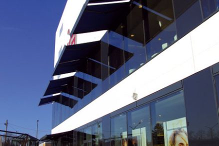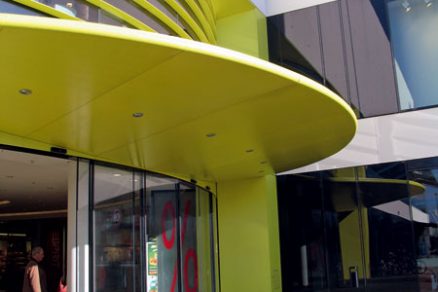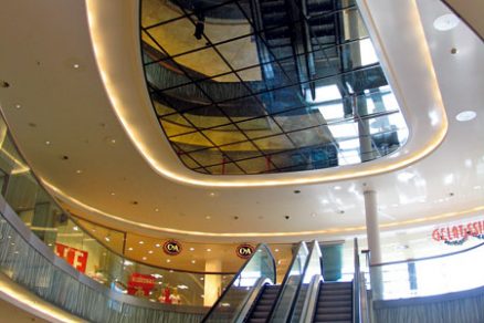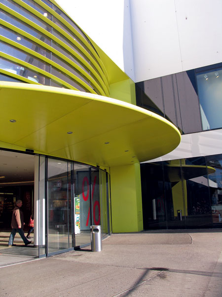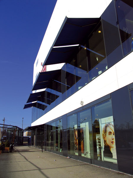 Šoférovi v aute sa naskytne ešte zaujímavejší pohľad. Kým pred sebou vidí budovu v určitých farbách, v spätnom zrkadle má ten istý objekt úplne iný kolorit. Nákupné centrum sa tak pred očami návštevníkov mení na veľký mestský kaleidoskop. Vo fasáde sú zabudované aj zrkadlové štvorce, ktoré reflektujú okolité prostredie a vnášajú do celkového obrazu vlastnú dynamiku a ilúziu hĺbky.