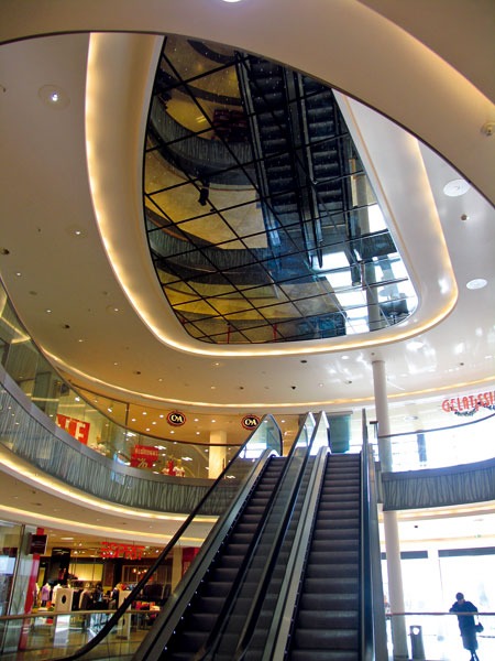 Základným cieľom riešenia bolo ušetriť plochu, čas aj energiu a súčasne vytvoriť príjemné prostredie pre zákazníkov. Vnútorný dizajn sa zameriava na prírodné motívy a materiály, napríklad prírodný kameň a drevo. Na podčiarknutie priateľskej atmosféry sa použilo sklo, najmä na zábradliach kruhových galérií. Architekti sa zamerali na dispozíciu s krátkymi komunikačnými zónami, vďaka čomu sa možno kamkoľvek rýchlo a ľahko dostať. K dispozícii je spolu 22 eskalátorov a 15 výťahov. Stredisko je kompaktným celkom, ktorý napriek malej ploche pôsobí veľmi priestranne. Vertikálne prepojenie jednotlivých podlaží sa otvára vo dvoch kruhových galériách, severnej a južnej, nazývaných aj fóra. Zostupné a vzostupné eskalátory severnej galérie sa kvôli zachovaniu priehľadov nepohybujú rovnobežne jeden vedľa druhého, ale vo vzájomnom postavení zvierajú kosý uhol. Na najnižšom podlaží, ktoré je pod úrovňou terénu, sa nachádza umelé jazero s fontánou.