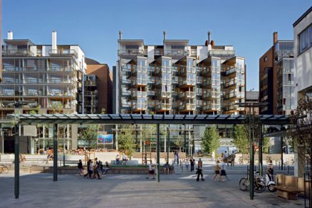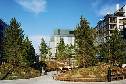 Námestie Tennispalatsinaukio je zase formované fasádami obytných domov, obchodov a reštaurácií. Charakteristickým znakom obytných domov sú veľké terasy s glazovanou povrchovou úpravou. Drevo sa prezentuje – presne podľa fínskej tradície – ako kontaktný materiál medzi verejným a súkromným priestorom.