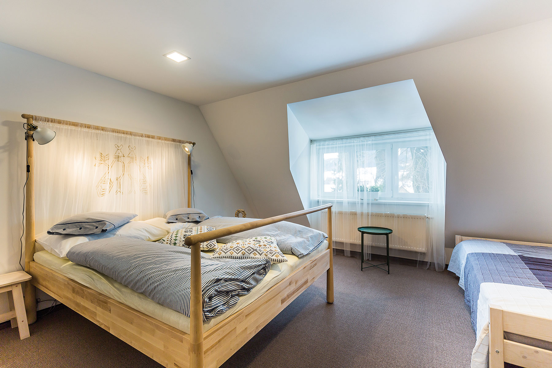 Okrem štylizovaného motívu figúry vyzdobilo dámske trio interiéry originálmi miestnych krojov, ktoré majiteľka zbiera od mladosti, dobovými fotografiami a ďalšími regionálnymi artefaktmi. Podstatnú úlohu v zariadení interiéru hrá celková umiernenosť – viete, že ste v Čičmanoch, ale zároveň ide o modernú interpretáciu, ktorá ľudové prvky využíva na zútulnenie a vyzdvihnutie originality priestoru. Dokonca aj zariadenie nábytkom v severskom štýle z obľúbeného reťazca výborne zapadá do konceptu.