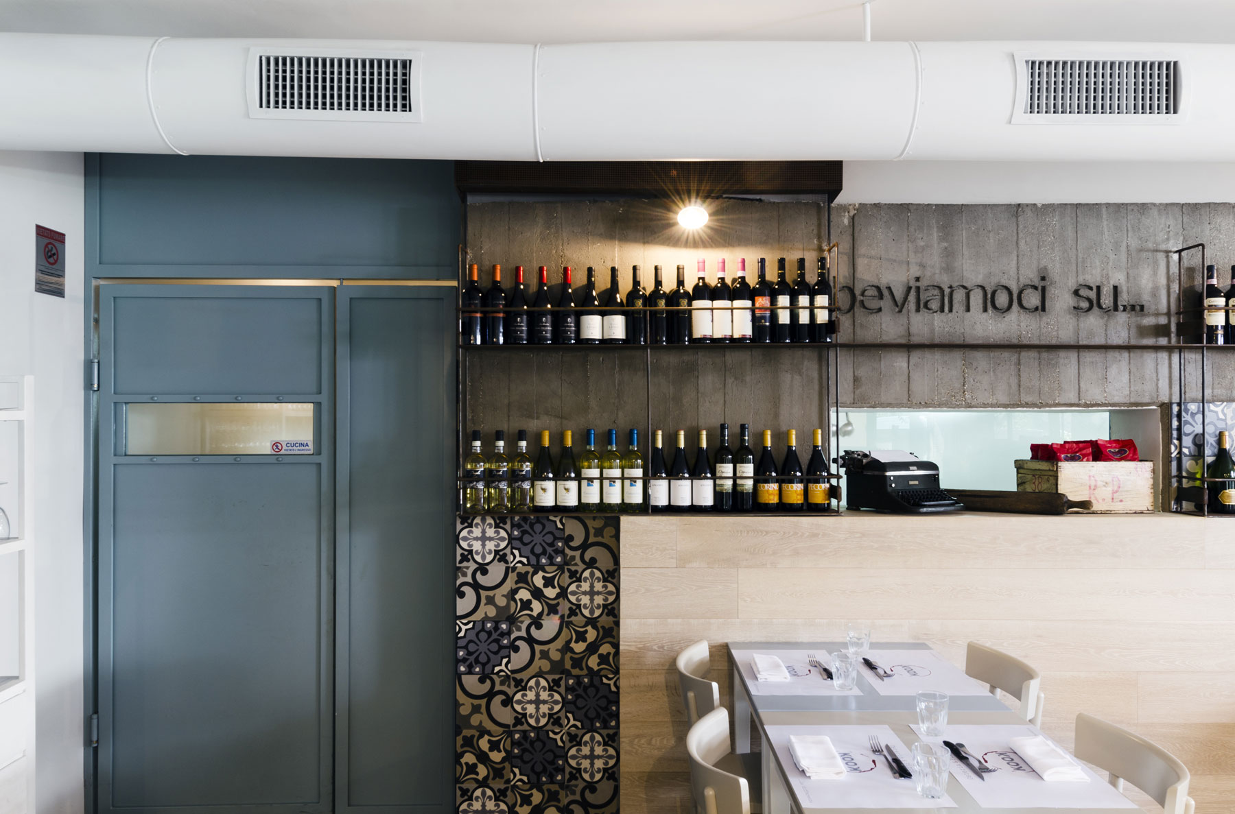 Snaha o dodržanie charakteristického výrazu prostredia, v ktorom sa reštaurácia nachádza je badateľná aj v podobe rafinovanej kombinácie rozličných druhov podlahových materiálov: od parkiet v medovej farbe až po priemyselnú podlahu a klasické stredomorské farby betónovej dlažby.