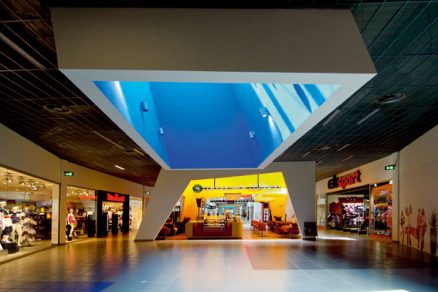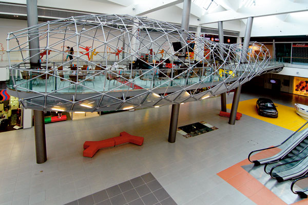 Hmota objektu skutočne pôsobí oveľa subtílnejšie, než býva pri nákupných strediskách zvykom. Centrum sa rozkladá do plochy, z veľkej časti je jednopodlažné a do výšky sa dvíha iba v priestoroch vstupu. Vznikla tu dvojpodlažná galéria s lomenou strešnou konštrukciou, cez ktorú vďaka zaskleniu vstupuje do priestranného interiéru množstvo denného svetla. Motív lomeníc sa opakuje aj v uličných pasážach obchodného centra.