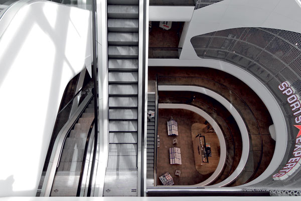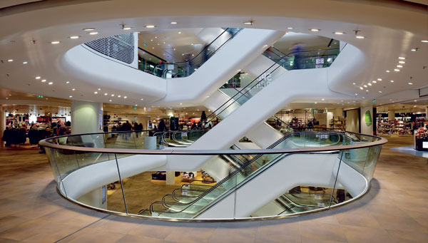 Hlavný vstup do obchodného domu je zdôraznený mierne vysunutým arkierom. Samotný vchod je, naopak, v parteri zapustený pomocou zaoblených bočných stien s jednoznačným cieľom pritiahnuť zákazníkov plynulým pohybom z ulice do vnútra objektu. Takmer étericky poňatý exteriér je v zaujímavom kontraste s jednoznačne futuristicky načrtnutým interiérom. Dominantným prvkom je sústava eskalátorov zakapotovaných v zaoblenej sadrokartónovej forme. Vertikálny pohyb je akousi dobrodružnou výpravou. Nejasné prechody medzi vertikálami bočných stien v átriu a horizontálami stropov jednotlivých podlaží vytvárajú dojem vesmírneho korábu. Aj bodové osvetlenie rozmiestnené zdanlivo náhodne dotvára nečakaný zážitok. Otvor átria ohraničuje cylindrické sklenené zábradlie zakrivené v dvoch smeroch. Každá jeho časť bola vyrobená na mieru z trojvrstvového lepeného skla.