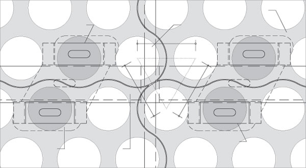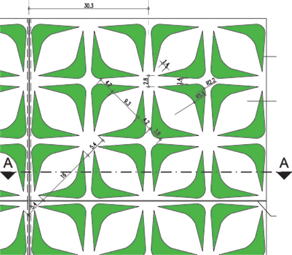 1 – zadný plech: celoplošne, hrúbka podľa požiadaviek, plech pokrytý vrstvou farby, celovzorovaný, 2 – predný plech: vystrihnutý do vzoru, hrúbka podľa požiadaviek, zafarbený na bielo, prilepený na zadný plech, 3 – styk platní v osi