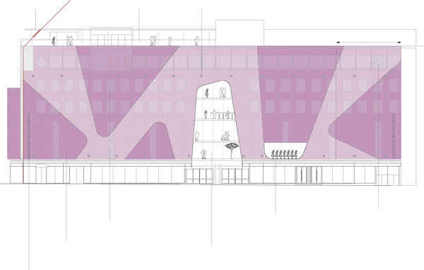 1 – protislnečná ochrana – rámy s výsuvnými slnečnými plachtami, 2 – zasklené zábradlie, 3 – príprava na vianočné osvetlenie, napojenie a uchytenie za fasádnym obkladom, 4 – držiaky reklamných zástav – 6 kusov, bodové držiaky cez predsadené fasádne elementy, 5 – fasádne elementy namontované na vertikálnu spodnú konštrukciu so vzduchovou medzerou, 6 – požiarny vstup – 2 kusy na každom podlaží, 7 – priznaný arkier, 8 – výklad, 9 – požiarny vstup