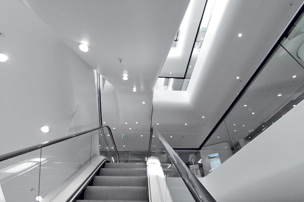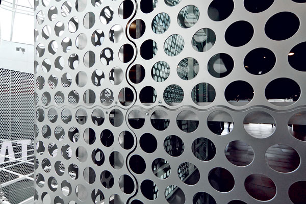 Ďalším originálnym prvkom sú patentované podhľady z perforovaného plechu. Práve správna veľkosť a hustota otvorov v hliníkovom plechu umožnili umiestniť do podhľadov celú potrebnú osvetľovaciu, informačnú aj bezpečnostnú techniku, a to bez jediného prerušenia jednoliatej stropnej plochy. Jednotlivé dielce sú zaoblené podľa perforácie, čo uľahčilo ich montáž.