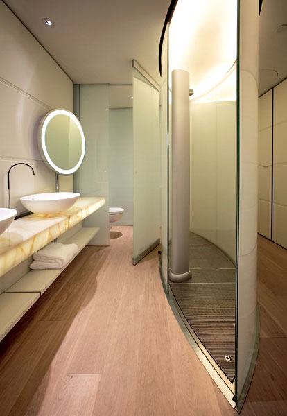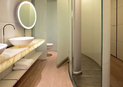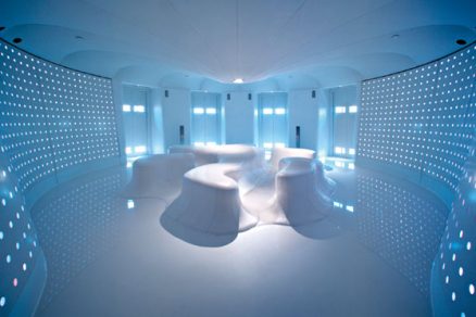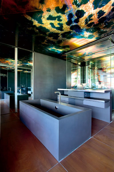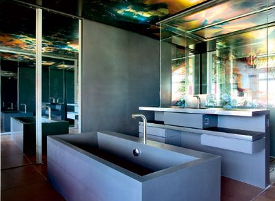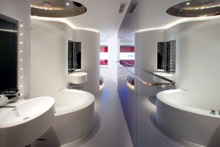 | Nielen Jean Nouvel umiestnil kúpeľňu z LG Hi-Macsu do centra dispozície. Na jeho poschodí je táto kúpeľňa prepojená s izbou presklenými posuvnými stenami s transparentnými veľkoplošnými fotografiami. | Medzi vybranými svetovými špičkami nechýbal ani sir Norman Foster a jeho ateliér. |
