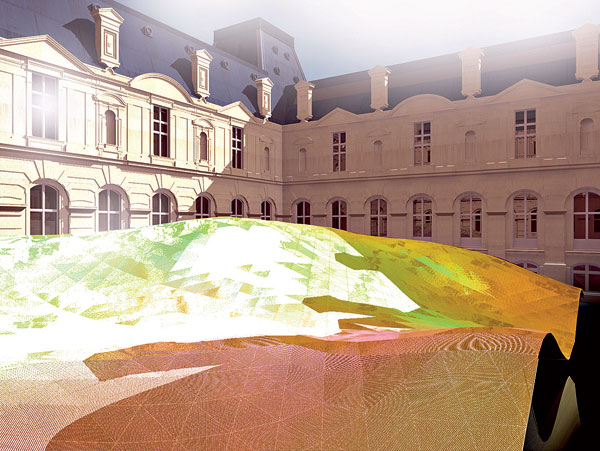 „Cour Visconti nebude zakrytý, v skutočnosti bude stále viditeľný,“ vysvetľujú autori hlavnú myšlienku návrhu. Nádvorie chcú zahaliť tzv. Dúhovým mrakom, ktorý by mal prepúšťať dostatok svetla a zároveň pred jeho nadbytkom, najmä v letných mesiacoch, chrániť všetky diela tak, aby sa nepoškodili. Ľudia v múzeu tak budú môcť pozorovať okolité fasády. Na dolnej úrovni poskytnú návštevníkom pohľad na „mrak“ priezory v podlahe. Obe úrovne zostanú motívom skleneného závoja zjednotené. Akýmsi odrazom horného mraku bude podlaha podzemného podlažia, ktorá bude pokrytá črepinami zo zlatistého skla.