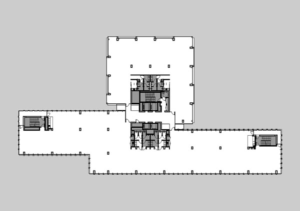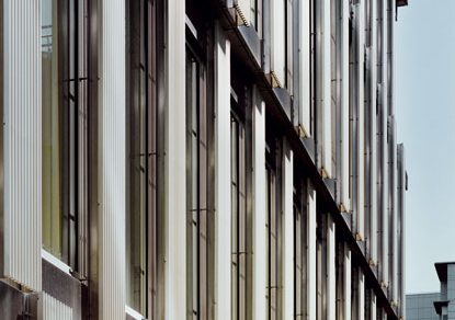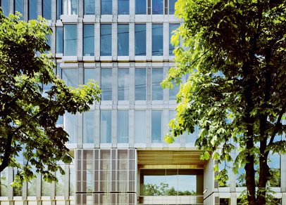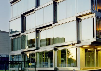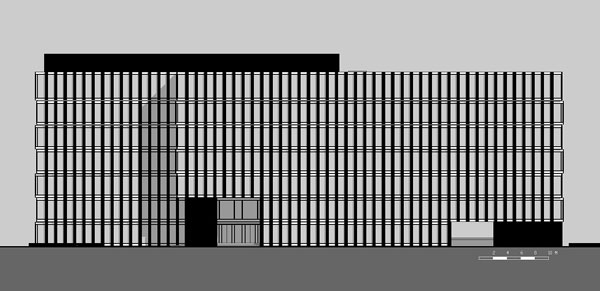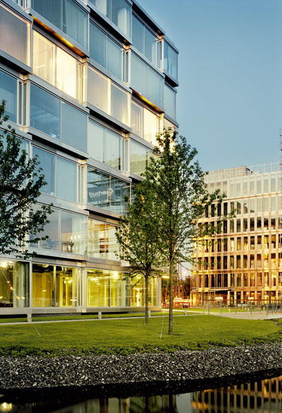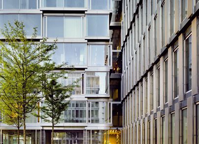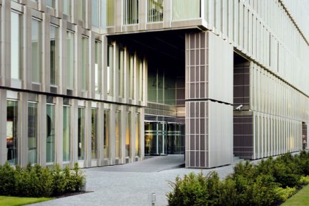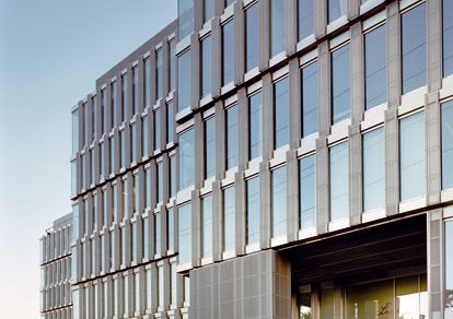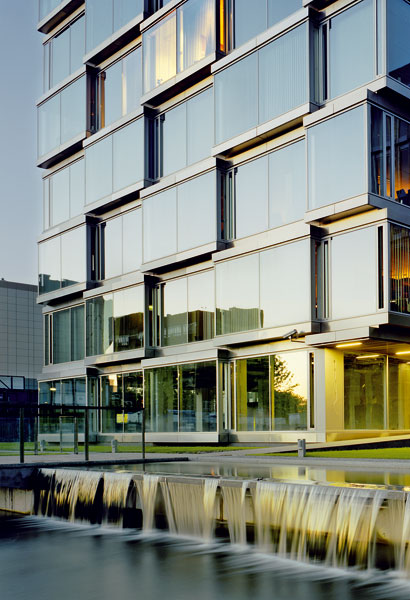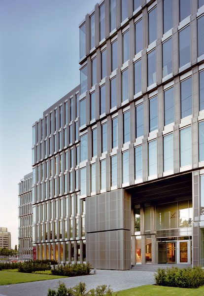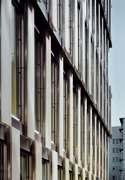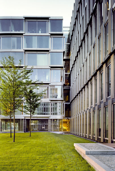 Odlišné štruktúry aj ich úlohy v urbanizovanom priestore sa odzrkadľujú vo vonkajšom stvárnení objektov. Zatiaľ čo trakty otočené do ulice pokrýva jednoliata fasáda z hustej oceľovej mriežky a so sklenou výplňou, fasáda vnútorných častí budov je celá sklenená.