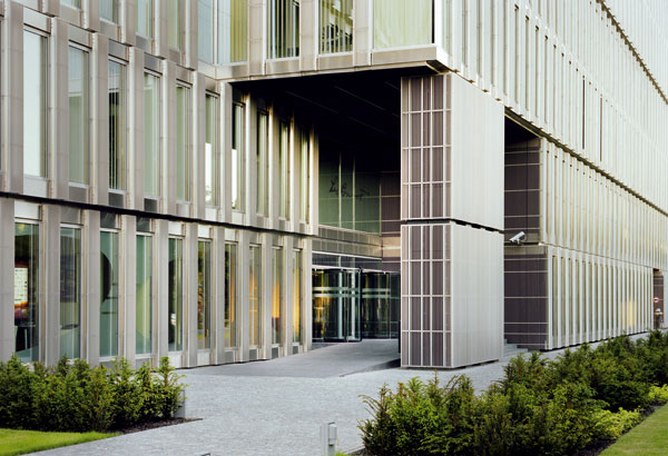 Opláštenie má zo strany verejných komunikácií výrazný vertikálny charakter, v intímnejšom prostredí vnútorného dvora sa zasa zdôrazňuje horizontálne vrstvenie. Z perspektívneho pohľadu teda vonkajšia tvár komplexu pôsobí uniformne a za svojím nepreniknuteľným plášťom chráni pracovné prostredie, kým časti smerujúce do pokojnej centrálnej zóny sú jej extrovertným protipólom.