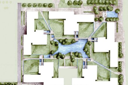 Komplex tvorí spolu päť budov, pričom každá sa navrhla podľa identického princípu. Všetky objekty rovnako pozostávajú z dvoch formálne odlišných častí. Uličné línie lemujú úzke predĺžené dvojkrídlové trakty, ktoré vytvárajú oddeľovaciu vrstvu medzi vnútorným parkom a okolitým prostredím. Druhú časť, orientovanú do uzavretej zóny komplexu, predstavujú objekty, ktoré svojim tvarom pripomínajú neúplné kocky. Tieto trakty sa napájajú na pozdĺžne útvary, ale pôsobia akoby voľne pohodené v zelenom srdci areálu s umelým jazierkom.