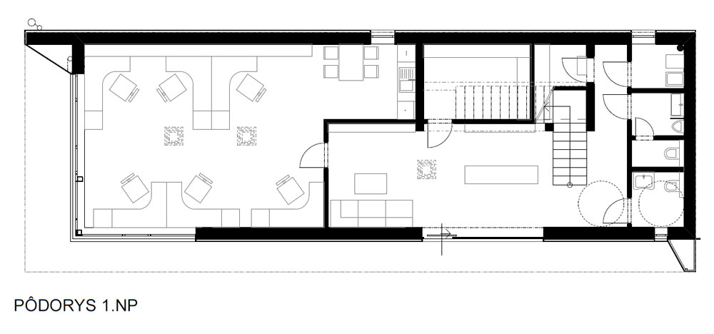 Prvé nadzemné podlažie otvára vstupná hala s recepciou, do ktorej sa vstupuje zo západnej strany. Odtiaľto je aj priame napojenie na skladovú časť. Severnú časť dispozície vypĺňa otvorený priestor kancelárie pre šesť osôb. K tomuto prináleží i pohodlné zázemie pre zamestnancov. Dolné podlažie tvoria aj samostatný archív, serverovňa a hygienický blok.