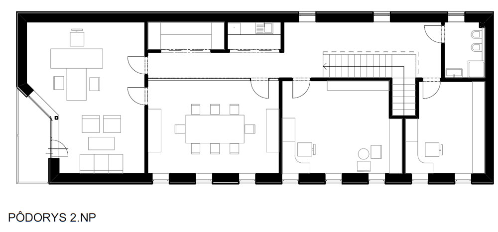 Druhé nadzemné podlažie je prístupné schodiskom zo vstupnej haly. Hlavné funkcie poschodia tvoria kancelária riaditeľa, zasadačka a dve nadväzujúce kancelárie pre zamestnancov. Ostatné priestory sú navrhnuté ako obslužné – zázemie a hygienický uzol.