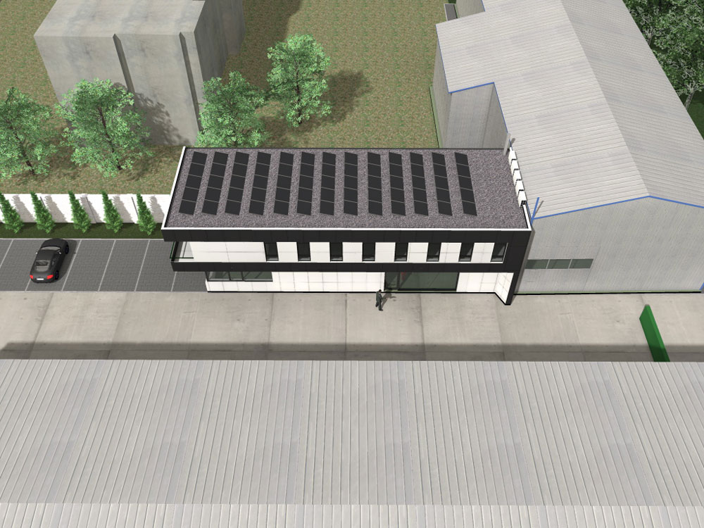 Plochý tvar strešného plášťa umožnuje umiestnenie fotovoltických panelov, ktoré sa podieľajú  na zlepšení energetickej bilancie budovy.