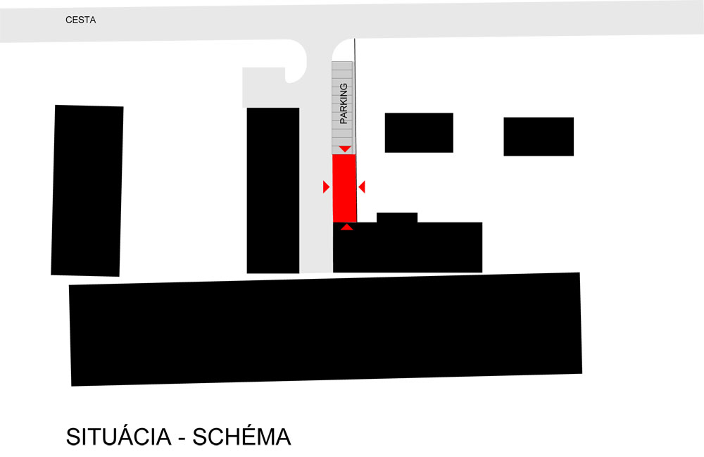 Nový administratívny objekt plynulo nadväzuje na existujúcu výstavbu v areáli bývalého družstva obdĺžnikovým pôdorysom.