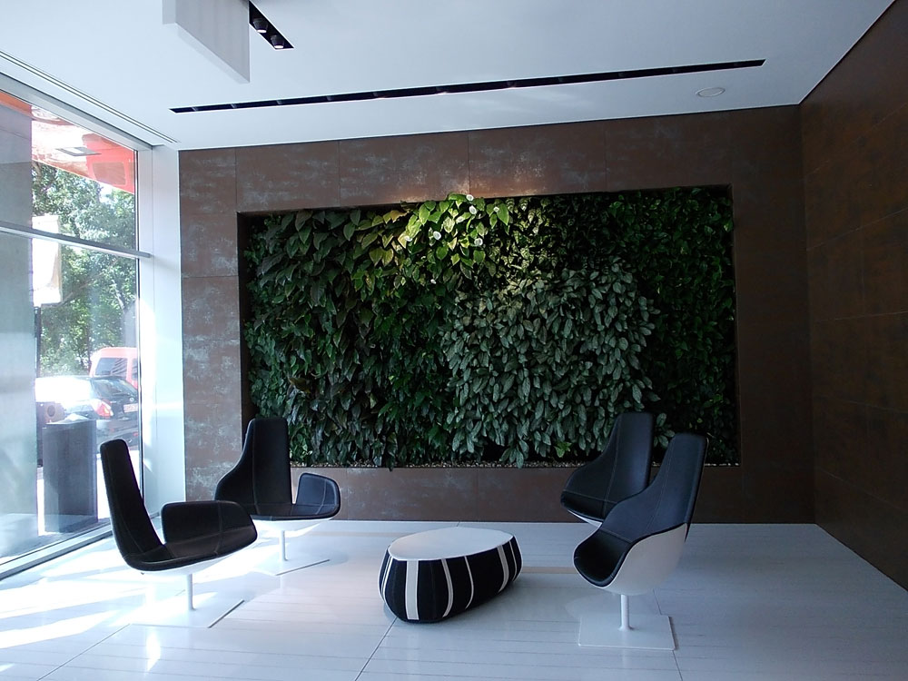 Použitie dizajnového nábytku v interiéri. V pozadí vidieť zelenú stenu z tmavozelených rastlín v kombinácii s tmavohnedým obkladom.