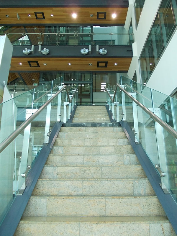 Pohľad na kombináciu antikora, kameňa a skla pri schodisku