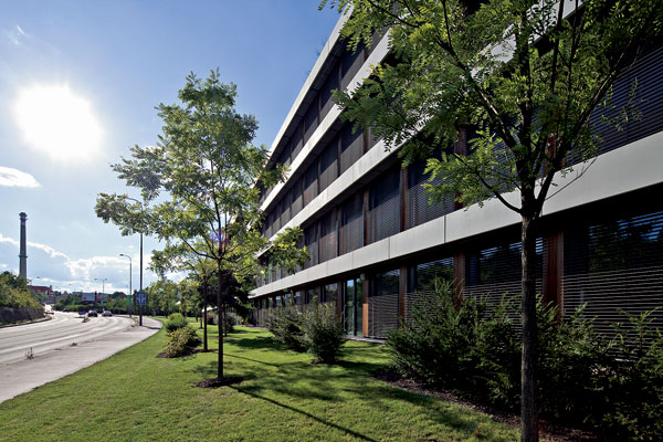 Na streche je vysadená nízko rastúca vegetácia, stromy a kroviny vo vrstve substrátu s hrúbkou až 1,6 m. Zelená strecha a popínavé rastliny na fasádach zlepšujú tepelnoizolačné vlastnosti budovy a redukujú efekt mestského tepelného ostrova.