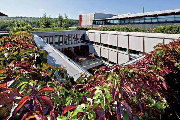 Na streche budovy sa nachádza 2 500 m2 trávnika a rozličné druhy malých kríkov vrátane popínavých rastlín, ktoré zakrývajú časti fasády. Popínavé rastliny sa použili aj v rámci vnútorných dvorov, čím sa podarilo opticky prepojiť strešné záhrady s vnútorným prostredím.