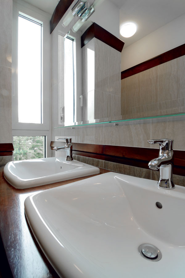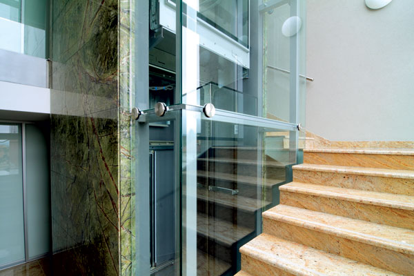 Vchody do objektu sú umiestnené v deliacich oblastiach zasklených schodísk. Dostatok denného svetla kombinovaný s výhľadom na mesto a Bratislavský hrad dodáva aj týmto spoločným priestorom punc lukratívnosti – nehovoriac o vyslovene luxusnom materiálovom riešení. Schodisko je z lososovej žuly a pevné časti výťahovej šachty sú obložené zeleným mramorom. „Ide o druh mramoru rain forest green, ktorý sa vyznačuje výrazným žilkovaním. Jeho cena sa teda zvyšuje o pozornosť, ktorú musia obkladači venovať ich napájaniu,“ opisuje architekt zvláštny materiál. Dodáva, že jeho výberom chceli spolu s investorom dosiahnuť symboliku stromu, ktorého konáre, znázornené žilami, sa týčia do výšky a komunikujú tak s borovicami v exteriéri. Farebná kombinácia zelenej a lososovej je trocha excentrická, no je to vec vkusu. Zaujme aj technické riešenie schodiskového priestoru. „Náš ateliér tradične preferuje riešenie trojhranného schodiska s výťahom uprostred,“ hovorí architekt. „Výhodou je, že výťah sa neopiera o žiadnu stenu bytu a neruší tak obyvateľov,“ dodáva. Výťahová šachta je celosklenená, takže aj z vnútra výťahu sú k dispozícii výhľady/ čo umožňuje vizuálny kontakt s okolitými priestormi. Pri vytváraní architektonického návrhu si investor stanovil podmienku, že z jedného schodiska môžu byť vstupy len do dvoch bytov, aby sa tak zachovala rodinná atmosféra stavby. Premyslene, no jednoducho riešené je kamuflovanie technických skriniek v rámci podesty – sú zakryté posuvnými dverami z mliečneho skla.