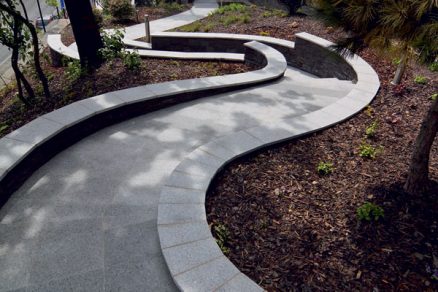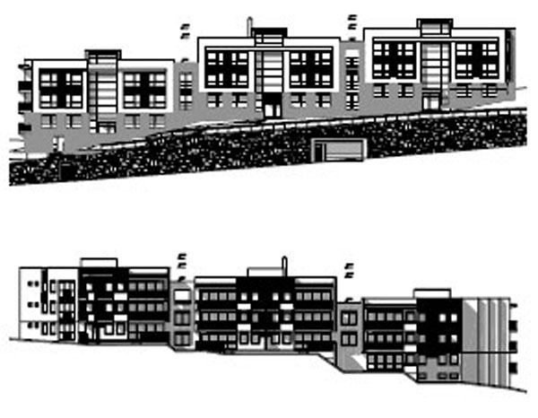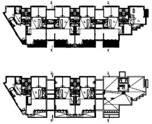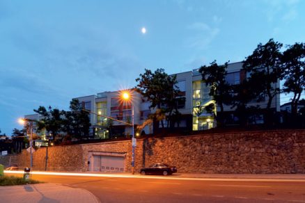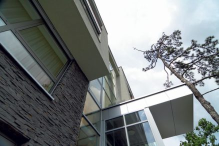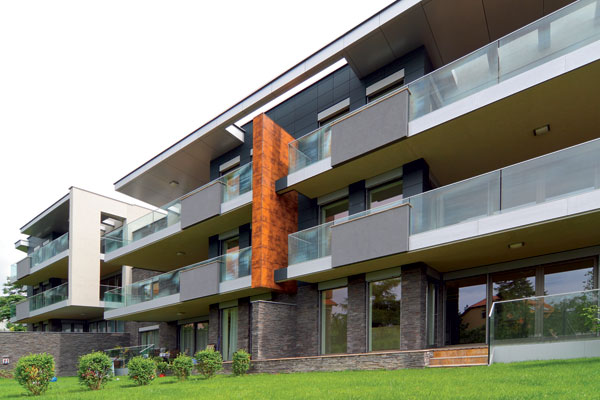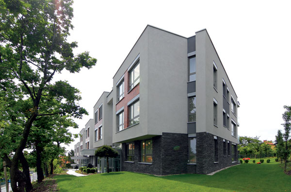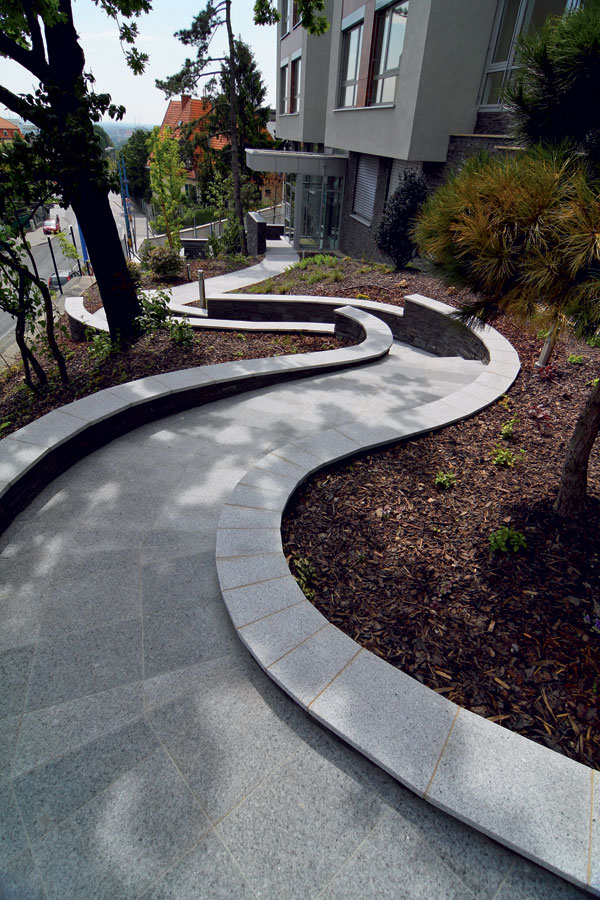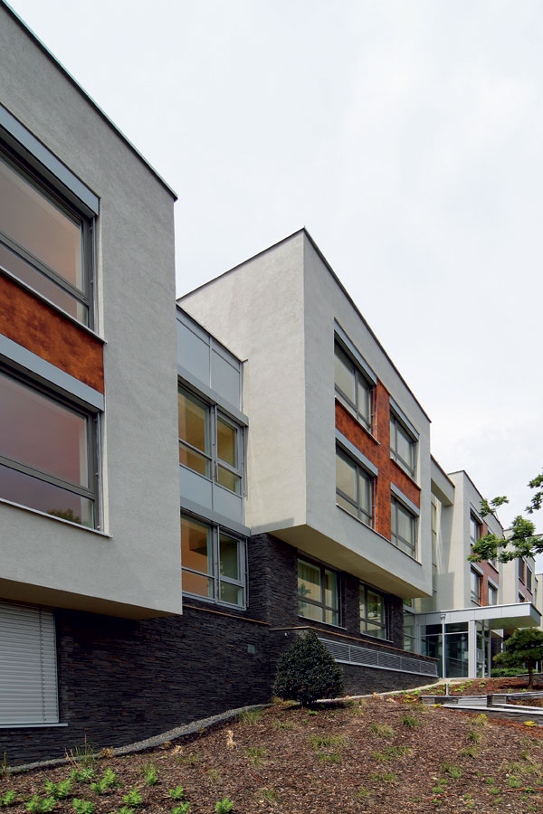 Uličnú fasádu spestruje zeleň, ktorej veľká časť zostala stavbou nedotknutá. Pred oknami spální a zasklenými stenami schodiska sa týčia voňavé borovice, dodávajúce objektu dovolenkový nádych. Príjemným dojmom pôsobí aj schodisko, ktoré sa vinie od vstupnej brány v opornom múre až ku vchodom do jednotlivých častí domu – vytvára meandre ako zvlnená rieka a je orámované nepravidelne vysokým múrikom, ktorý kopíruje zvažujúci sa terén. Objekt má prízemie, dve nadzemné a dve podzemné podlažia. V suteréne sa nachádza 32 parkovacích miest, pričom bytov v objekte je 16 – každá domácnosť má teda k dispozícii dve parkovacie miesta. „Suterén bol jedným z kameňov úrazu tohto projektu, pretože vyvolal mnoho diskusií v radoch odporcov stavby. Tvrdili, že je to nadzemné, a nie podzemné podlažie. Pravda však je, že suterén je včlenený do zložitého skalnatého terénu, ktorý sa zvažuje, a v najnižšie položenej časti stavby je jeho malá časť nad zemou. Norma však presne hovorí o tom, čo je a čo nie je suterén a my sme ju dodržali,“ vysvetľuje architekt Peter Jančo. Medzi dvoma podzemnými podlažiami sa autá premiestňujú autovýťahom.