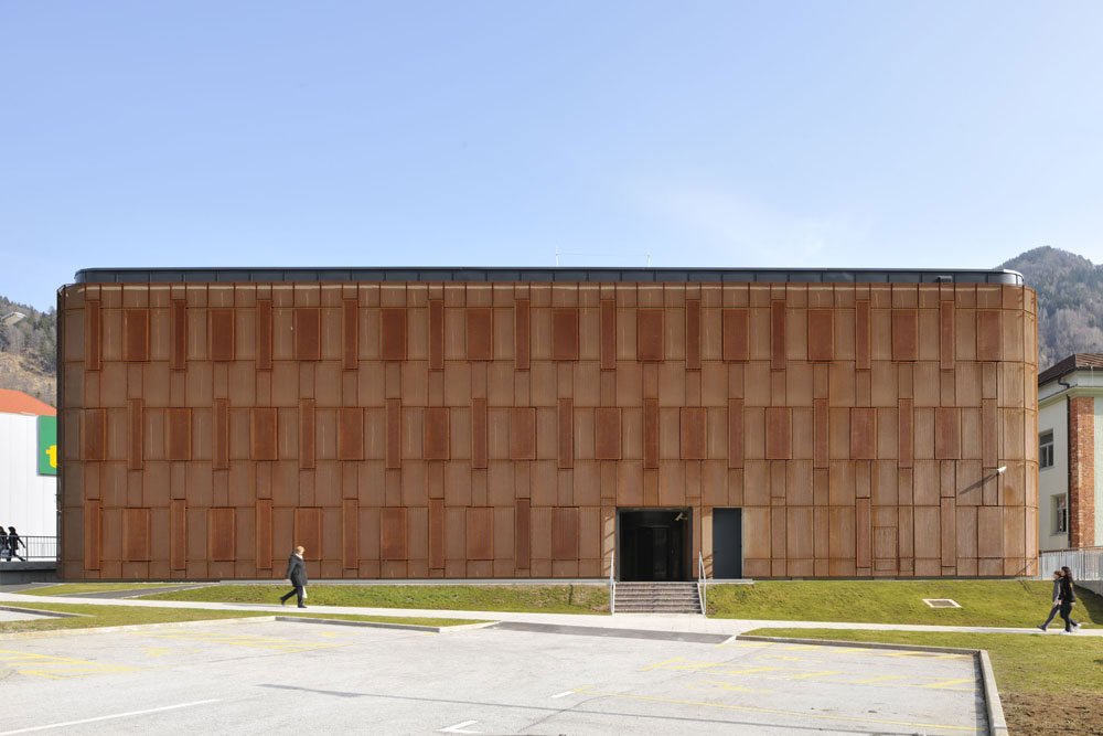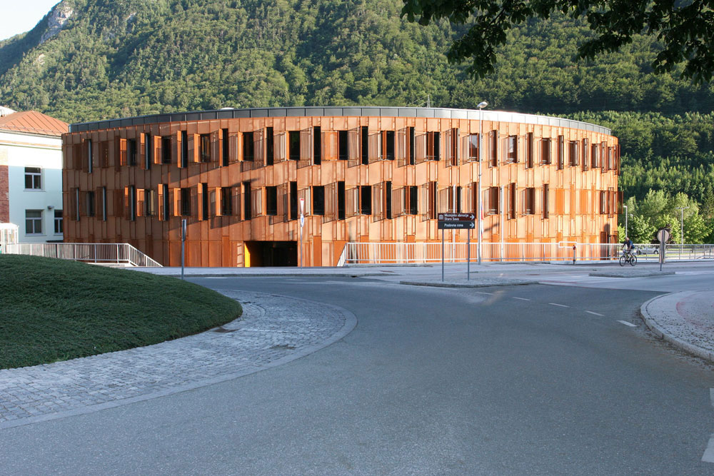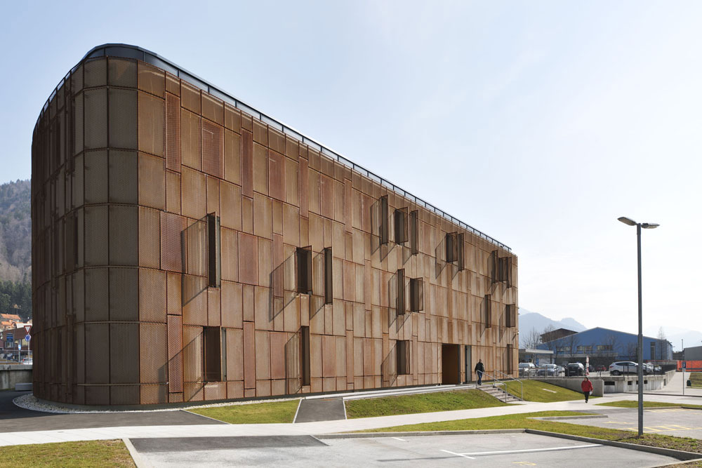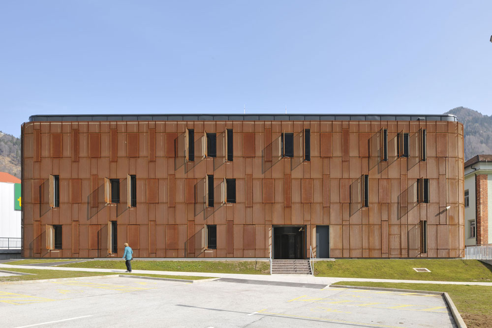 Mesto Jesenice v slovinskom pohorí Karavanky má dlhú oceliarsku históriu. Tento priemysel je tu prítomný všade, mnohé domy ho pripomínajú svojou červenou – hrdzavou – farbou. Asi ťažko by tu mohla nová budova štátnej správy vzniknúť z niečoho iného ako práve z ocele. Navyše, keď priamo pred ňou stojí socha oceliara.