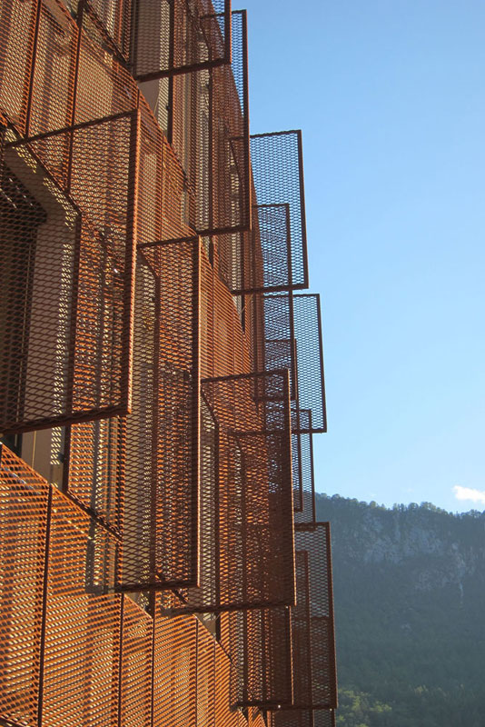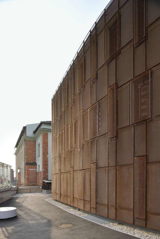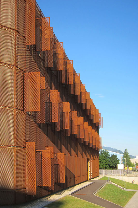 Vonkajší plášť budovy jasne odkazuje na oceliarsku históriu mesta. Je vyrobený z Cortenu, ktorý patinuje nízkolegovanú oceľ valcovanú za studena. Obsahuje menej uhlíka ako bežná uhlíková oceľ a je obohatená meďou a fosforom. Na začiatku, v období, keď je konštrukcia vystavená bežným poveternostným podmienkam, sa na jej povrchu vytvorí tvrdá ochranná vrstva, ktorá výrazne spomaľuje proces ďalšej korózie. Vzhľadom na to, že ďalšie povrchové úpravy už nie sú potrebné, je takáto oceľ považovaná za ekologickejšiu, pretože je stopercentne recyklovateľná. Z cortenových panelov sú vytvorené aj okenice. Chránia exponovanú administratívnu budovu pred prehriatím a poskytujú príjemný tieň.