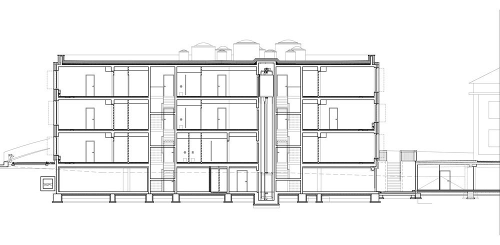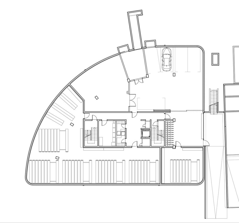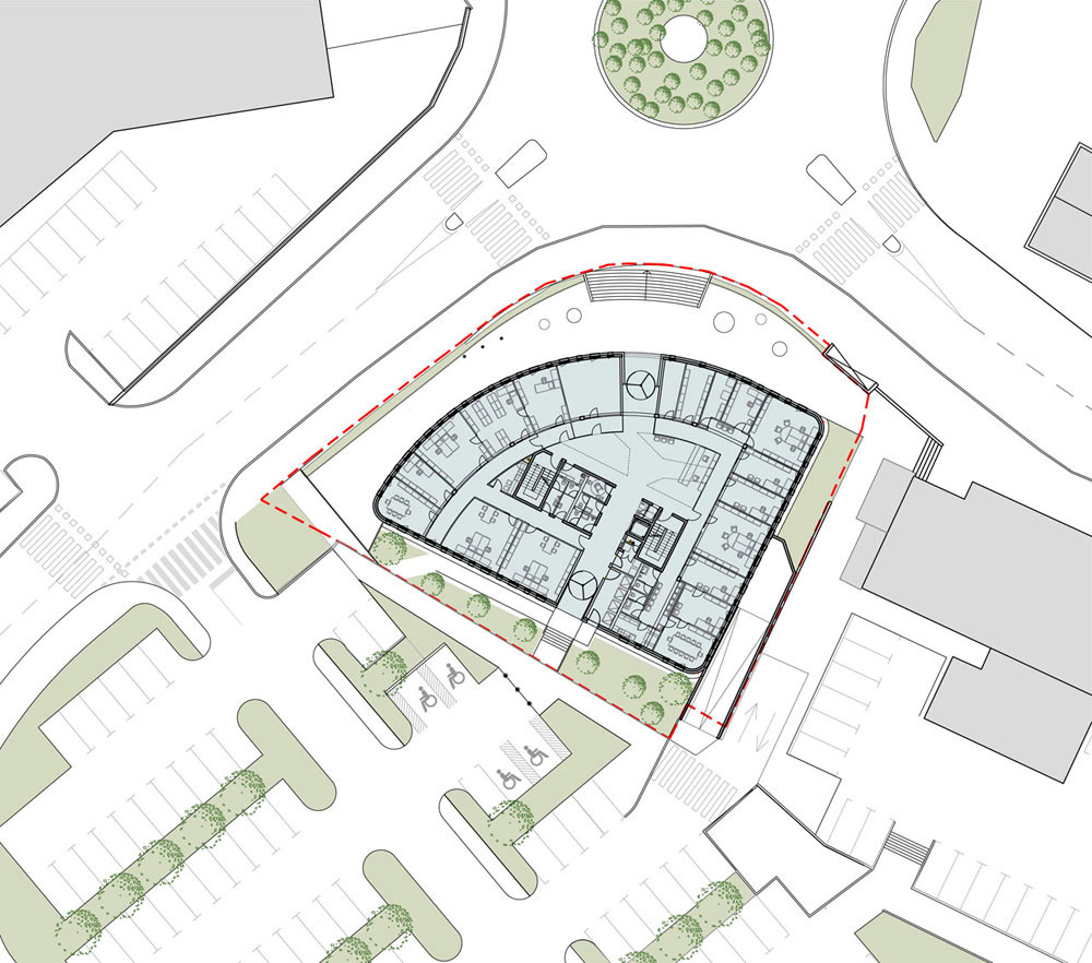 Z juhozápadnej strany budova susedí iba s vlastným parkoviskom.