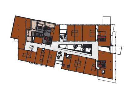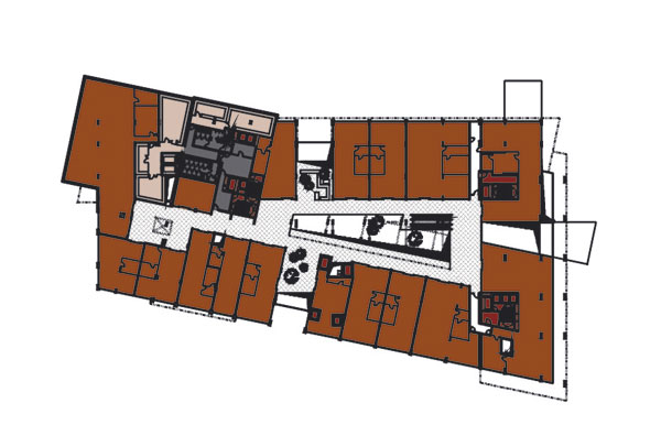 Aj preto architekti jeden blok tejto uzavretej štruktúry zdvihli nad druhé krídlo a vytvorili otvorenú štruktúru s výhľadom na okolité územie a zelené strechy, ktoré sú navrhnuté na týchto blokoch. Objekt je koncipovaný ako prechodné ubytovanie, a preto bude časť fasády z juhu tieniť mostová časť domu. Tá však zároveň tvorí akýsi slnolam a chráni fasádu pred priamym juhozápadným slnkom. Výsledkom je netradičná kompozícia hmôt vytvárajúca pôsobivú hru tvarov, ale aj výrazovú dominantu celého územia.