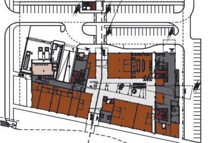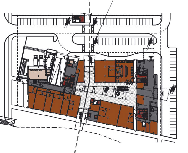 Na prízemí sú umiestnené všetky komunikačné vstupy do objektu a zároveň únikové trasy z objektu. Hlavný vstup do hotela je orientovaný z Rožňavskej ulice a vchádza sa ním do hotelovej haly, ktorá má aj bočný vstup pre príchod autami. Krížom cez objekt vedie pasáž, ktorá prepája územie perspektívne budované za týmto hotelom so zastávkou MHD. Pri vstupe do pasáže je ďalší vchod do apartmánovej časti, kde sa návštevníci dostanú dvojicou výťahov do mostovej časti objektu. Na severovýchodnej fasáde objektu je umiestnený hlavný vstup do garáže. Na prvých troch podlažiach sa bude nachádzať obchodný sektor, nad ktorým bude zo severovýchodnej strany apartmánovo-administratívna časť. Tá je z juhozápadu zdvihnutá v tvare mosta. Slúži na dlhodobé ubytovanie nájomcov, ktorí chcú mať pohodlie domácnosti, ale nechcú byť ubytovaní v hoteloch. Obyvatelia budú mať prenajaté jednotlivé apartmány a takisto si môžu prenajať administratívne priestory na rokovania. Táto časť v pôdorysnom tvare dvoch L, ktoré sú do seba obrátené, má jedno centrálne jadro s výťahmi. Má aj samostatné výťahy do mostovej časti, čo umožňuje separovať vstupy do objektov.