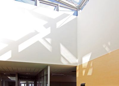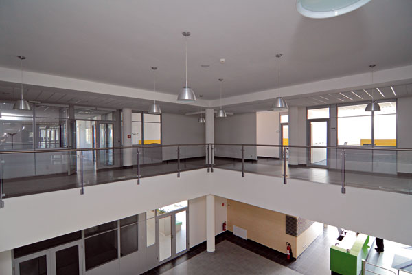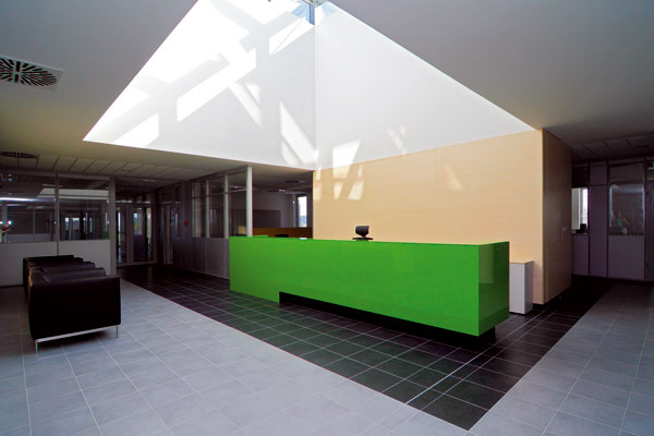 „V krížení striech vo východnej časti objektu sa nachádza strešný svetlík s rozmermi 5 × 5 m z oceľovej konštrukcie, opláštený zaveseným fasádnym systémom s bezpečnostným sklom. Osvetľuje priestrannú chodbu na treťom podlaží,“ hovorí Ivan Šurina. V mieste kríženia striech v západnej časti architekt navrhol plochú strechu, na ktorej uložili zariadenia vzduchotechniky. Strecha je prístupná obsluhe strešným otvorom zo schodiska. Z tohto miesta je tiež možný prístup servisnými dvierkami do medzistrešného priestoru sedlových striech.