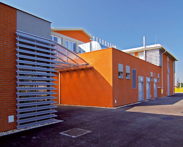 Stavebný objekt je navrhnutý ako 3-podlažná samostatná budova s 2-podlažným koncovým traktom, v ktorom sa nachádza riadiace centrum. Sedlová strecha, ako aj fasáda obložená z lícových tehál v kombinácii so šedou silikátovou omietkou korešpondujú s rázom okolitej vidieckej zástavby. Tradičnú oranžovú tehlu dotvárajú jednoduché zasklené línie, situované v nárožiach budovy. Na zasklených stenách je zavesená hliníková fasáda so slnolamami.