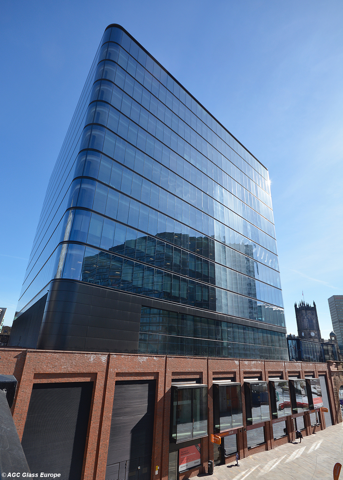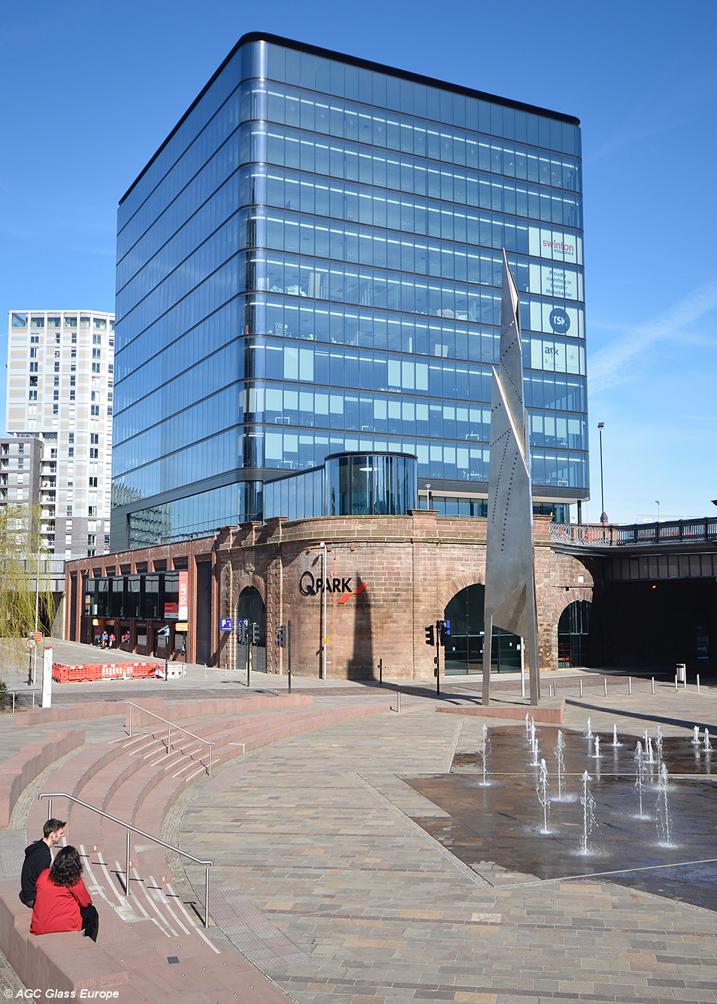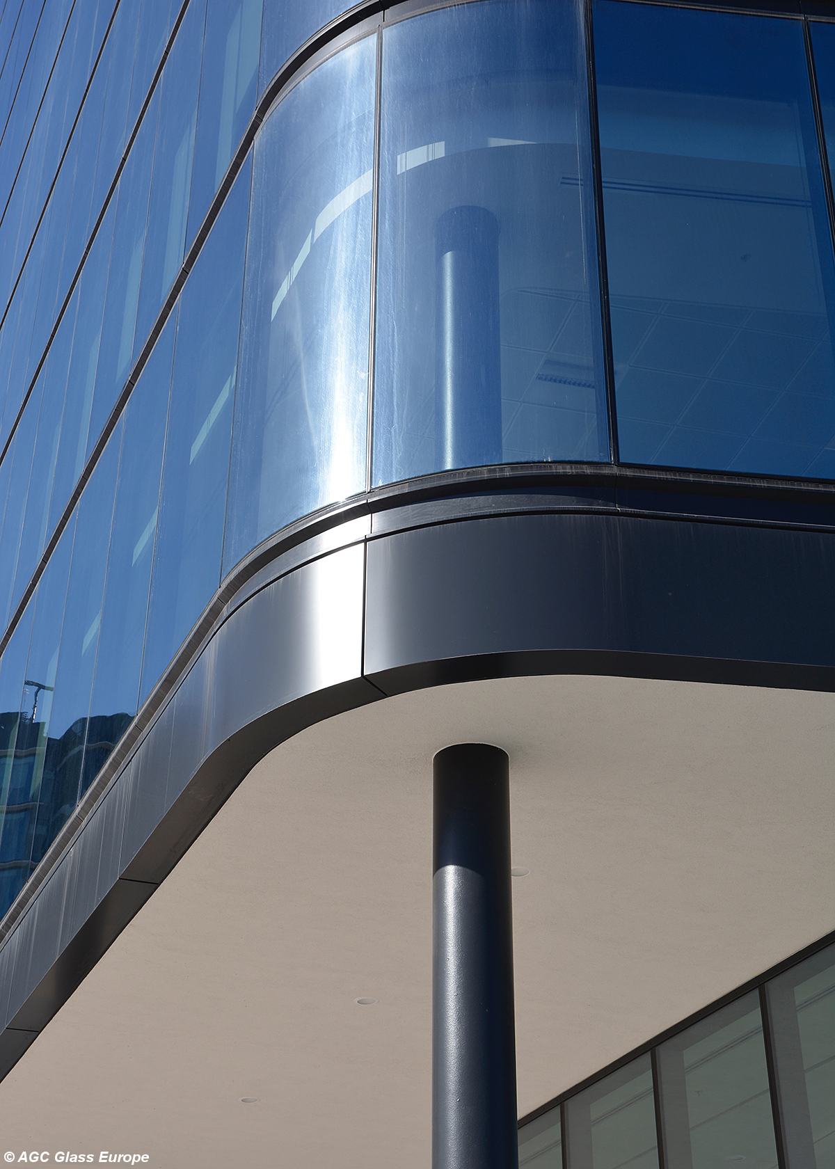 Na celosklenenú fasádu sa použilo okolo 8 000 m2 skla s protislnečnou ochranou Stopray Vision-50. Tepelne spracovaný variant Stopray Vision-50T bol použitý výhradne na časť fasády s oblými rohmi. Sklo AGC bolo zvolené vďaka svojej neutrálnej estetike a predovšetkým s ohľadom na to, že v prípade zakriveného skla možno dosiahnuť rovnaký vzhľad ako v plochom zasklení, pričom sa zachovajú rovnaké technické parametre. Zakrivená sklenená plocha navyše vyzerá veľkolepo a bezproblémovo splýva s rovnými plochami fasády. Stopray Vision-50 je ideálne riešenie na celosklenené fasády. Vďaka kombinácii svetelného prestupu 50 % s veľmi dobrou protislnečnou ochranou blokuje toto neutrálne sfarbené sklo až 72 % solárnych ziskov a zároveň ponúka nízkou hodnotu Ug = 1,0 W /(m2. K). Tieto parametre vedú k udržaniu pohody a tepelného komfortu užívateľov budovy.