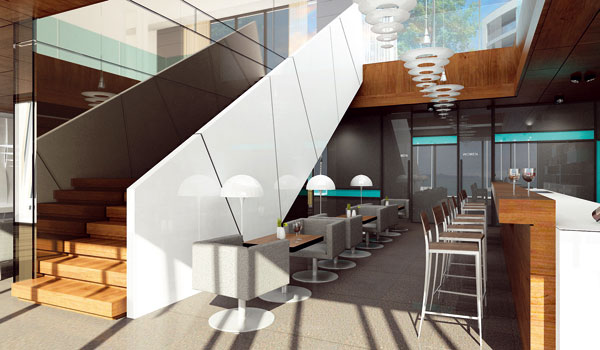 Interiéry „plachetnice“ ako architektonickej dominanty poskytnú vďaka trojdimenzionálnej zasklenej fasáde panoramatické výhľady na vodnú hladinu a do širokého okolia. Plachetnica bude náročnou konštrukciou železobetónových škrupín a oceľových priestorových štruktúr. Dynamizujúcim a premenlivým prvkom stavby má byť aj systém posuvných lamelových okeníc, ktorý sa osadí na celozasklenú fasádu so skleným zábradlím. Objekt bude svojím tvarovaním a osadením do terénu vytvárať vnútorný priestor, ktorý sa z dôvodu dobrého optického kontaktu s okolím zdvihne na úroveň prvého nadzemného podlažia. Vytvorí sa tak spomenuté zelené plató, otvorené na juhozápadnú stranu s výhľadom do okolia.