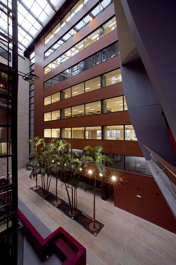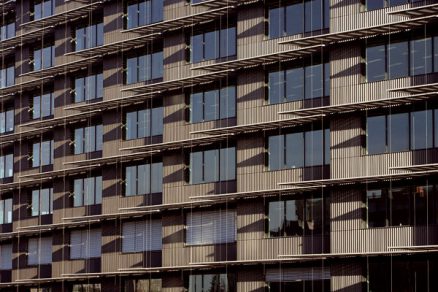 Ja by som povedal, že práve s akustickou fasádou. Jednak ma baví, že má funkciu, akú má, a jednak sa mi naozaj veľmi páči. Je to pre mňa skutočne favorit tohto domu. Obklady fasád sú z rôznych materiálov, čo všetko ste použili? Pieskovec, dosky s drevenou dyhou, čiže s imitáciou dreva. Základnými materiálmi sú kameň, sklo, pohltivé akustické obklady, sklenené rastre.