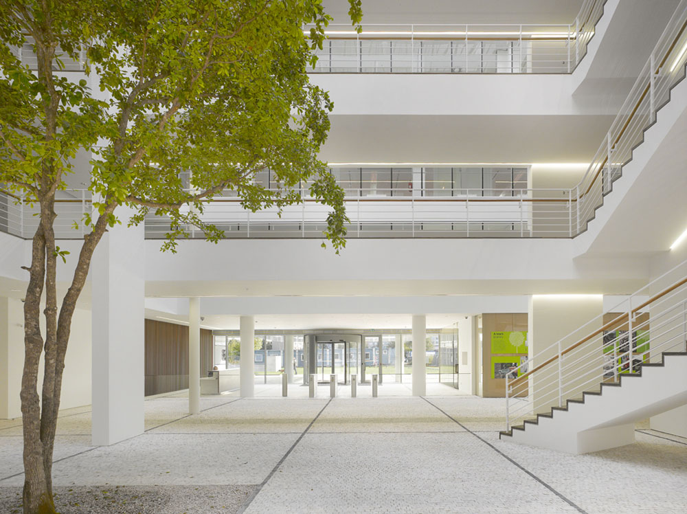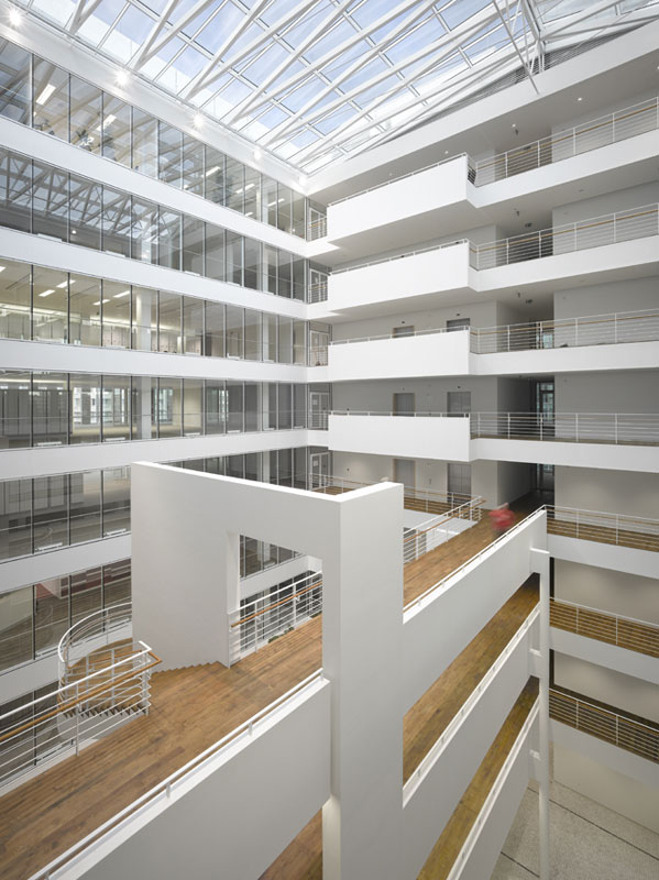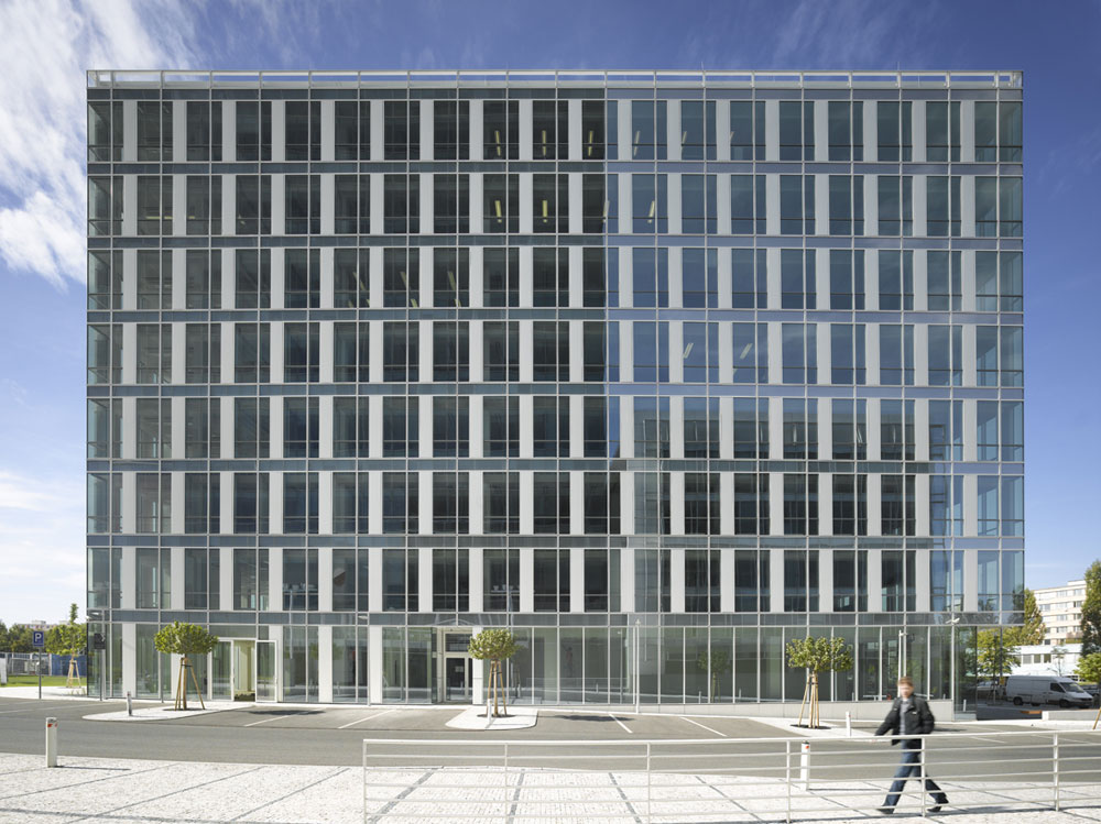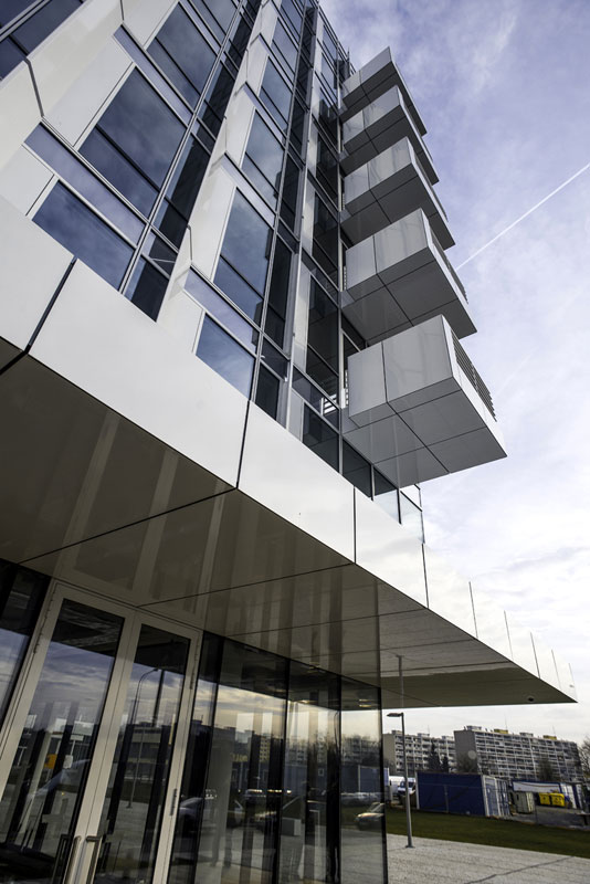 foto: Roland HalbeLe Corbusierov žiak a držiteľ Pritzkerovej ceny Richard Meier sa pri návrhu budovy City Green Court inšpiroval českým kubizmom. Na južnej a západnej fasáde vystupujú z kompaktnej hmoty balkóny so štvorcovým pôdorysom. Vertikálne visuté panely zároveň fasády rytmicky členia. Panely pomáhajú tieniť interiér a zabraňujú jeho prehrievaniu. Efektívne riešenie obvodového plášťa však nie je jediným prvkom, ktorý budove zaistil hodnotenie LEED Platinum. Treba spomenúť aj prirodzené vetranie vnútorného átria počas leta, zber dažďovej vody, zelenú strechu, efektívnu kontrolu kvality vzduchu vnútri a využitie miestnych i recyklovaných materiálov.