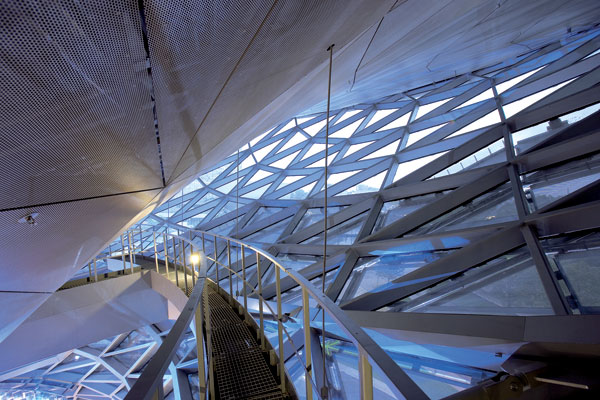 Forum, Tower a Double Cone spája vzdušná oblúková mostová konštrukcia ponúkajúca nezvyčajné panoramatické pohľady. Most je zavesený do stropu, prekleňuje Lerchenauerstrasse a pokračuje do BMW areálu nachádzajúceho sa na opačnej strane cesty (administratíva a múzeum), takže nedochádza k narušeniu premávky pod mostom.