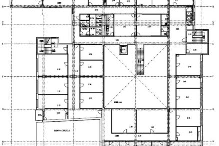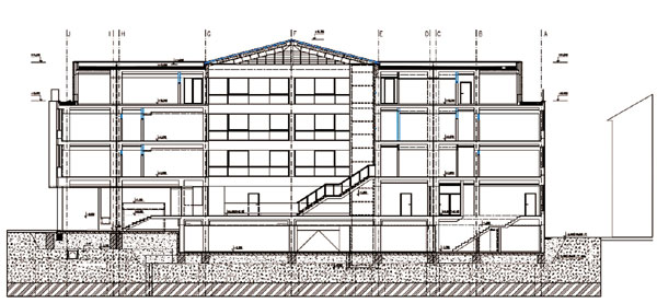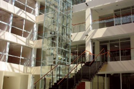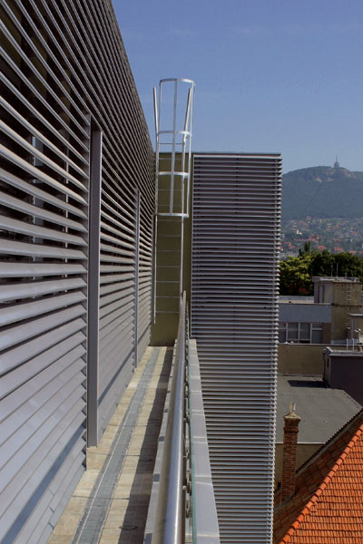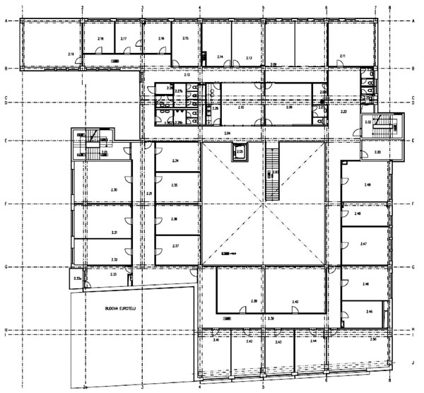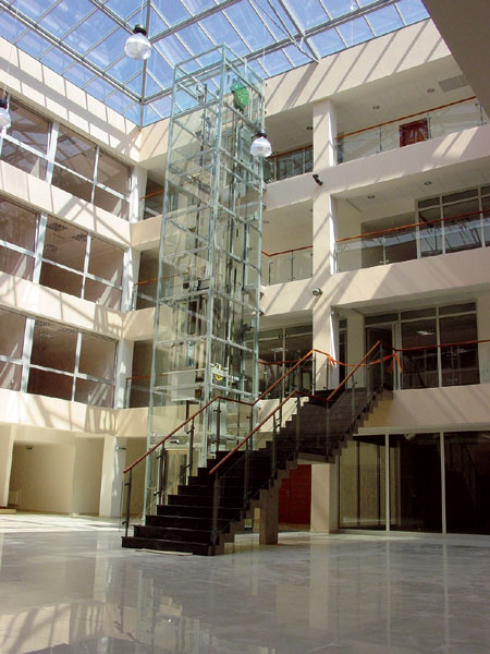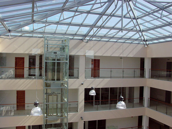 Pozemok s nepravidelným tvarom je vzhľadom na polohu medzi susednými objektmi pomerne stiesnený. Investor navyše žiadal jeho maximálne využitie. „Pre veľkú hĺbku traktov navrhovanej budovy sme ako základný kompozičný a funkčný prvok zvolili centrálne átrium so svetlíkom,“ objasňuje návrh jeden z architektov Rado Kachlík. Hlavným vchodom sa vstupuje do haly so štvorcovým pôdorysom – átria, ktoré odkrýva železobetónový skelet budovy. Skelet vyniká aj vďaka vizuálnemu potlačeniu zábradlí na pavlačiach. Výťah sa nachádza na protiľahlej strane haly. Architekti ho navrhli do priehľadného kubusu výťahovej šachty zo skla pre optické prepojenie s átriom. Schodiskové rameno vedľa výťahu spája prvé dve nadzemné podlažia.