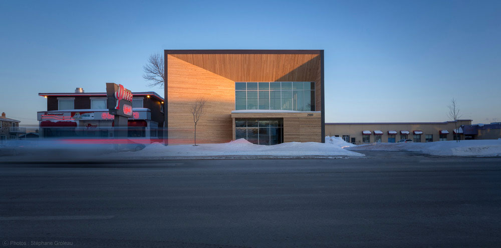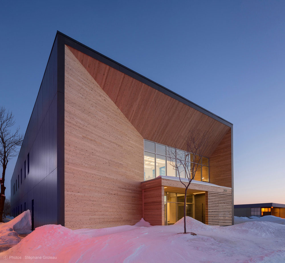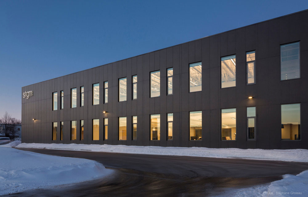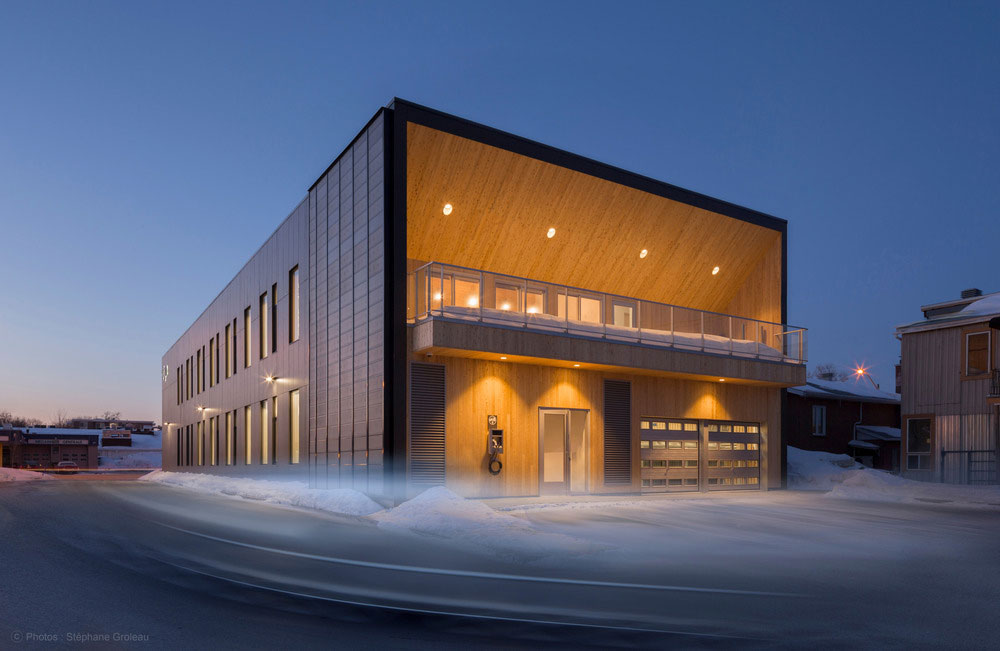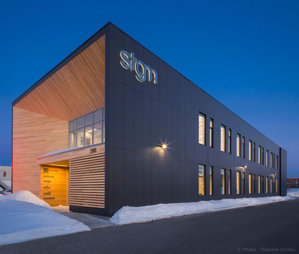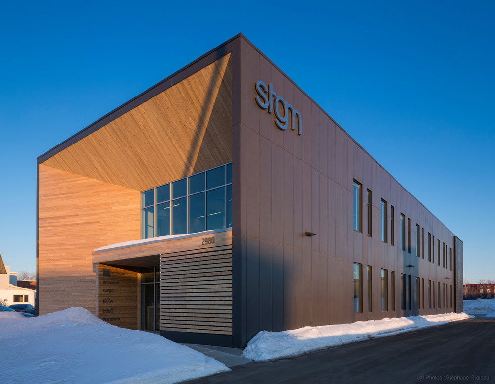 Ako veľkolepý príklad môže slúžiť nové sídlo architektonickej spoločnosti St-Gelais Montminy + Associés/Architectes (STGM) lokalizované vo štvrti Beauport v Quebec City. Ide o dvojpodlažnú budovu s plochou 1 000 m², ktorá kladie dôraz na architektonické inovácie ohľaduplné k životnému prostrediu. Budova ponúka výnimočnú úroveň komfortu pre svojich obyvateľov prostredníctvom dômyselnej integrácie obdĺžnikovej formy, ktorá je orientovaná na slnko, ďalej vďaka vzdušnej drevenej štruktúre, starostlivo vybraným materiálom a napokon vďaka minimálnej produkcii uhlíkovej stopy.