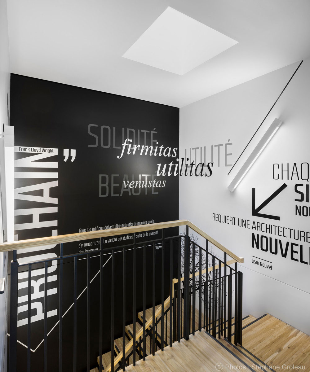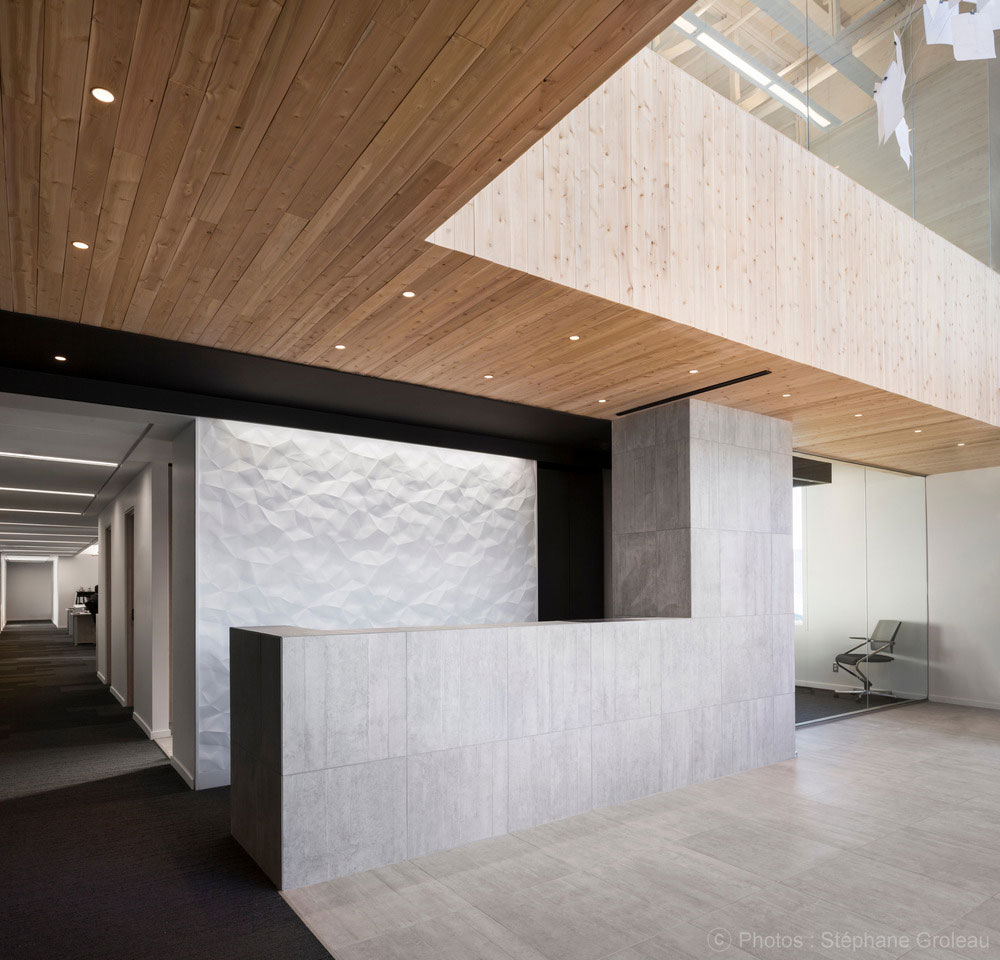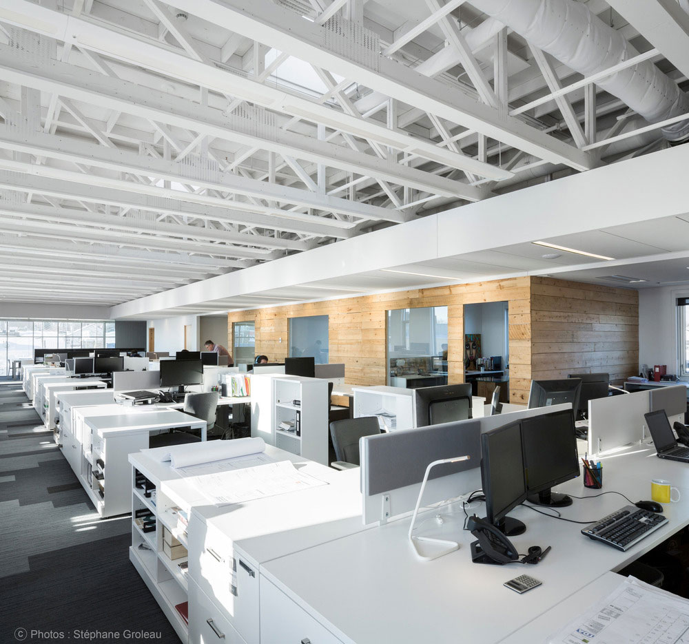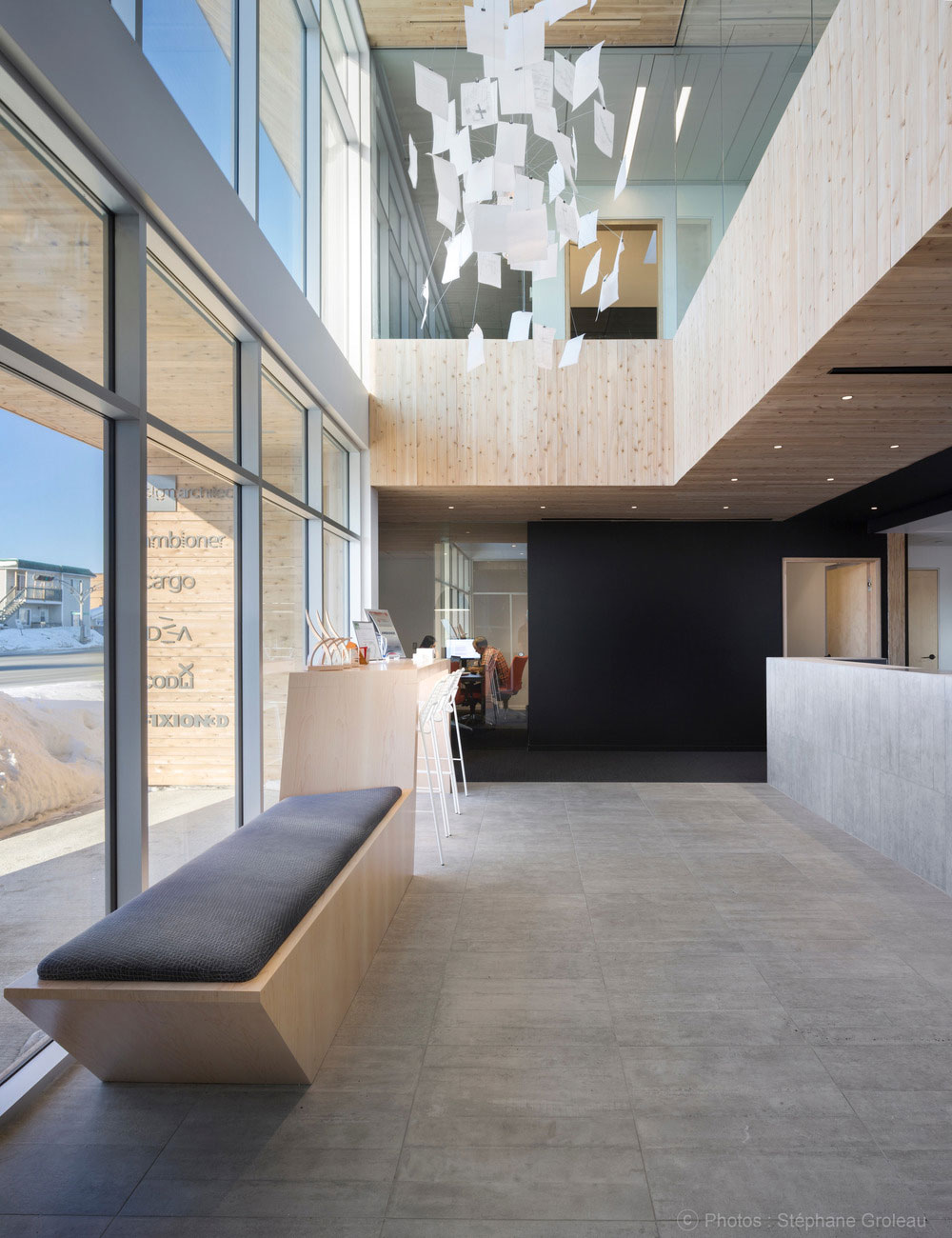 Ako veľkolepý príklad môže slúžiť nové sídlo architektonickej spoločnosti St-Gelais Montminy + Associés/Architectes (STGM) lokalizované vo štvrti Beauport v Quebec City. Ide o dvojpodlažnú budovu s plochou 1 000 m², ktorá kladie dôraz na architektonické inovácie ohľaduplné k životnému prostrediu. Budova ponúka výnimočnú úroveň komfortu pre svojich obyvateľov prostredníctvom dômyselnej integrácie obdĺžnikovej formy, ktorá je orientovaná na slnko, ďalej vďaka vzdušnej drevenej štruktúre, starostlivo vybraným materiálom a napokon vďaka minimálnej produkcii uhlíkovej stopy.