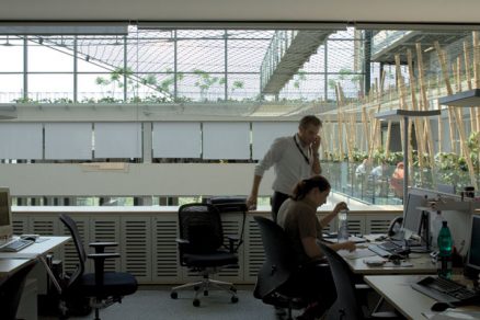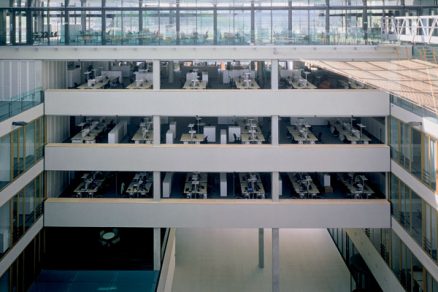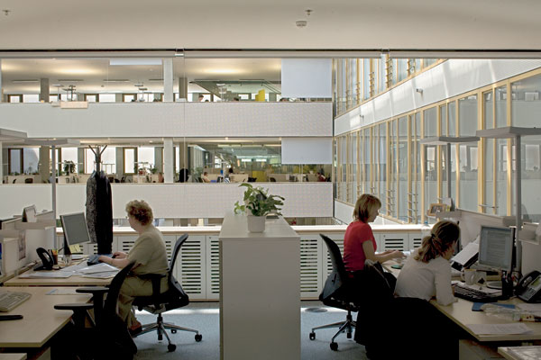 On má svoje miesto pridelené. Na svojom stole musí mať normové hodnoty, ktoré sú striktne dané našimi hygienickými predpismi. Ale usilovali sme sa o to, aby budova bola celkovo svetlá. Akonáhle chcete, aby budova bola všade svetlá, tak po jej obvode sú miesta príliš presvetlené. Táto disproporcia sa musí vyvážiť umelým svetlom a tiež vhodným zatienením. V niektorej časti miestnosti máte pocit tmy, pretože priestor pri okne je presvetlený. A tento rozdiel vnímate ako veľký kontrast, ktorý spôsobuje to, že správne osvetlené miesto vnímate ako tmavé. Vyvažovanie kontrastov je jedna z dôležitých vecí. Rád hovorím o harmonizovaní, vyvažovaní prostredia. Zvoliť správne umelé osvetlenie, aby ste vôbec nevnímal jeho pôsobenie, bolo veľkým problémom. Je v tom určitý primát, že sme zvolili väčšinové osvetlenie pomocou stojacích lámp a 90 percent svietenia cez biely strop.