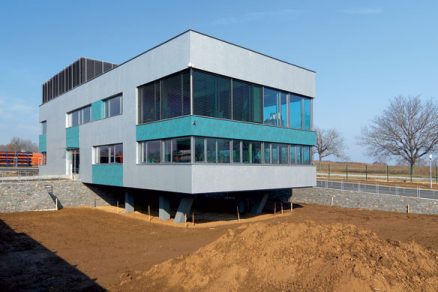 Kváder administratívnej budovy je osadený do terénu tak, aby približne polovica objektu bola vysunutá ponad okolitý terén. Materiálovo ide o kombináciu zasklených stien s kontaktným zatepľovacím systémom. Konštrukciu tvorí monolitický železobetónový bezprievlakový skelet. Aj obvodový plášť je väčšinou železobetónový, len miestami je doplnený murovanými konštrukciami s tým, že v priestoroch pre manažment sú veľké zasklené plochy. Ako obkladový materiál sa použili veľkoformátové dosky trespa s modrozeleným nádychom, ktoré zároveň prostredníctvom schodiskového jadra vizuálne prepájajú exteriér s interiérom. Omietka svojim charakterom (metalický náter) zároveň evokuje plechový fasádny obklad, ktorý vytvára príťažlivý výtvarný dojem.
