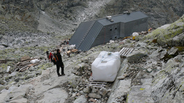 Počas výstavby sa používajú špeciálne vodovzdorné druhy betónu. Na betonáž základov sa dopravoval čerstvý betón. Pri stavebných prácach sa na chatu dováža suchá betónová zmes, ktorá sa mieša s vodou priamo na stavbe. Pri výstavbe sa používajú fúriky a miešačka je napojená na agregát. Priamo na chate sa okrem iného budú realizovať sadrokartónové obklady a dlažby. Najväčšou položkou pri výstavbe je zásobovanie materiálom. Počas zásobovania prišlo i k havárii vrtuľníka pri, ktorej sa však, našťastie, nikto nezranil.